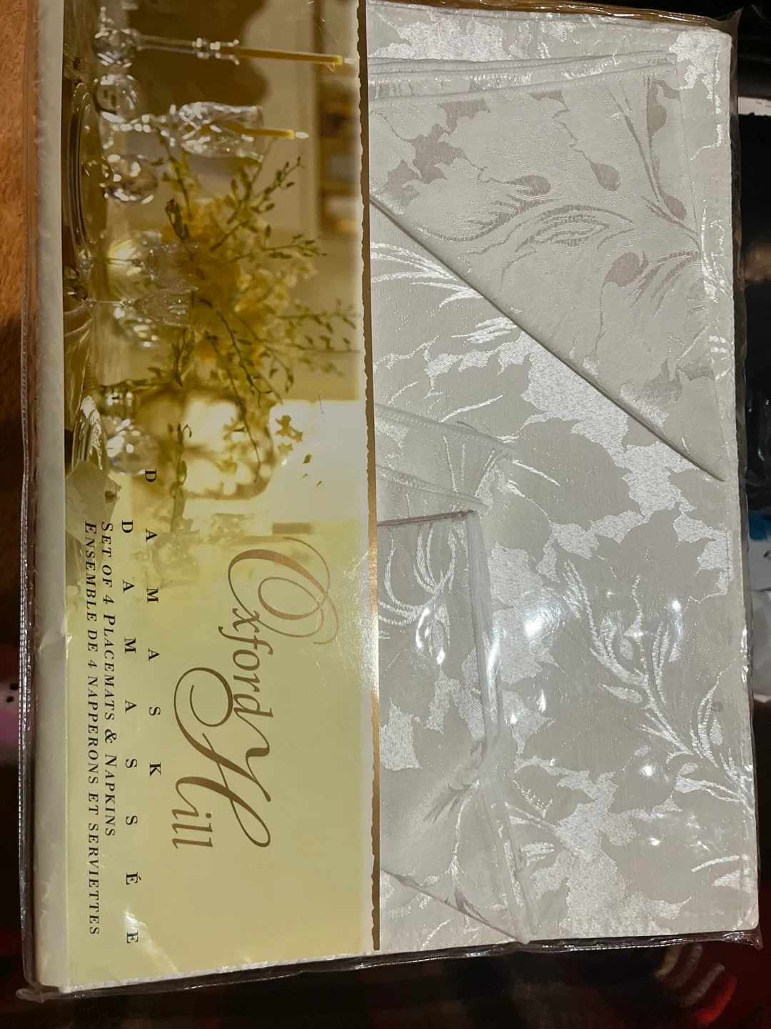 Selling a set of 4 Oxford Hill damask placemats and napkins. They're still in the original packaging!