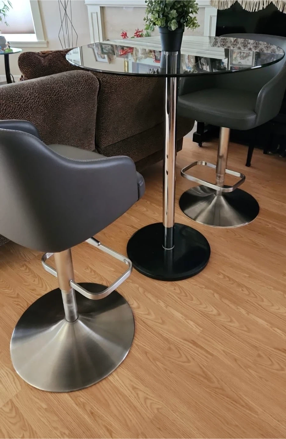 Selling a set of two modern bar stools. They feature a sleek design with black leather seats and a sturdy metal base. Perfect for adding a touch of elegance to your kitchen or bar area! They are in great condition and ready for a new home