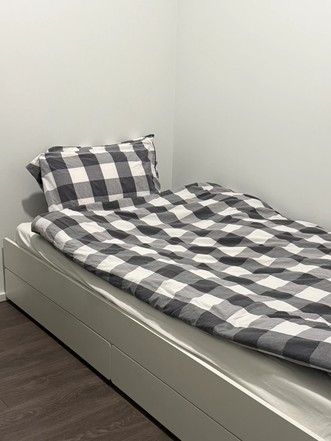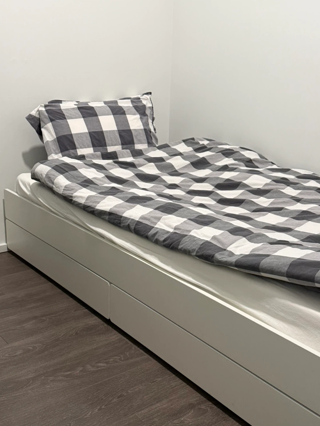 It's a twin-sized bed and comes with built-in storage drawers, perfect for a kid's room or guest room.