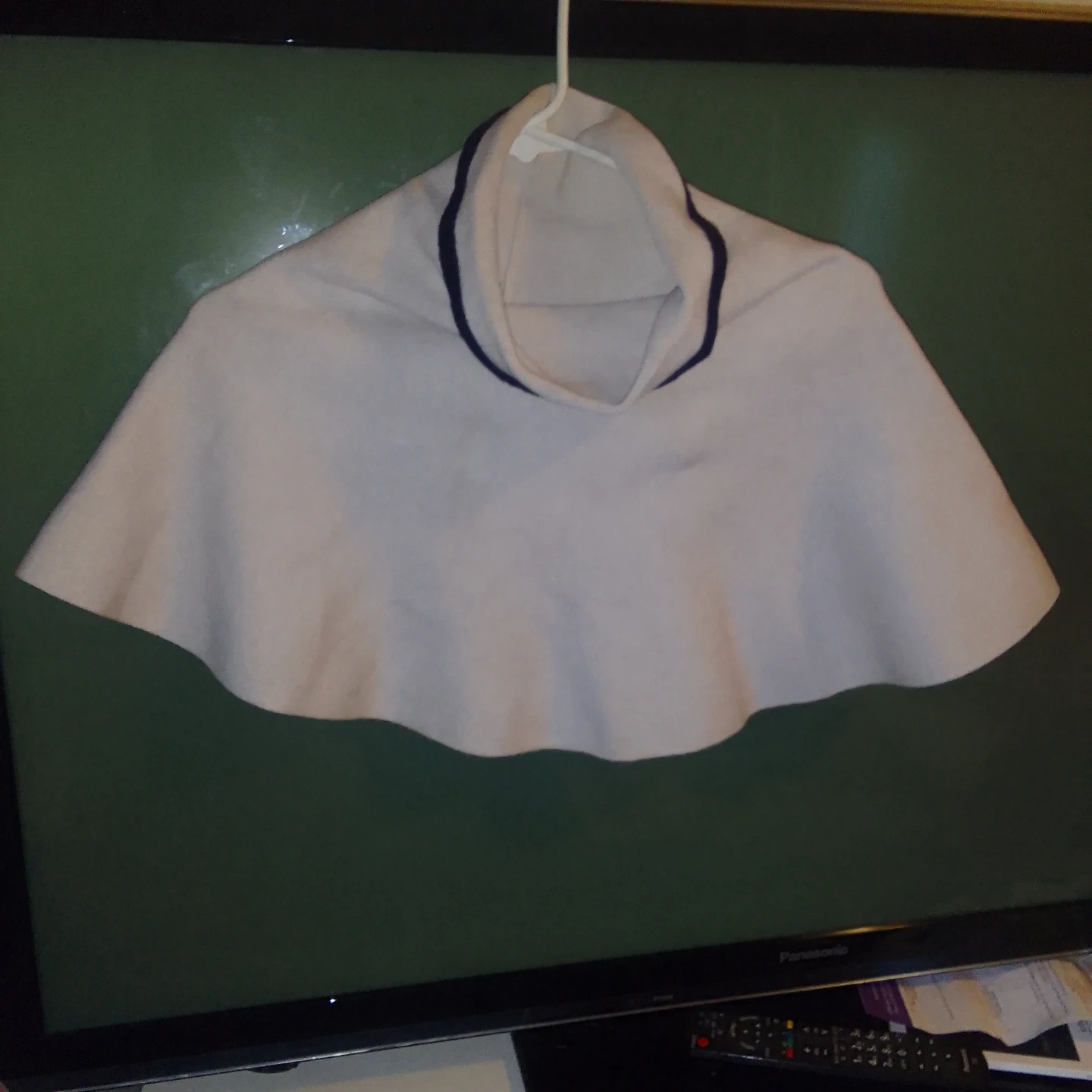 Here's a short cozy off-white fleece shawl neck warmer! It has a navy black trim. Perfect for keeping warm during the colder months