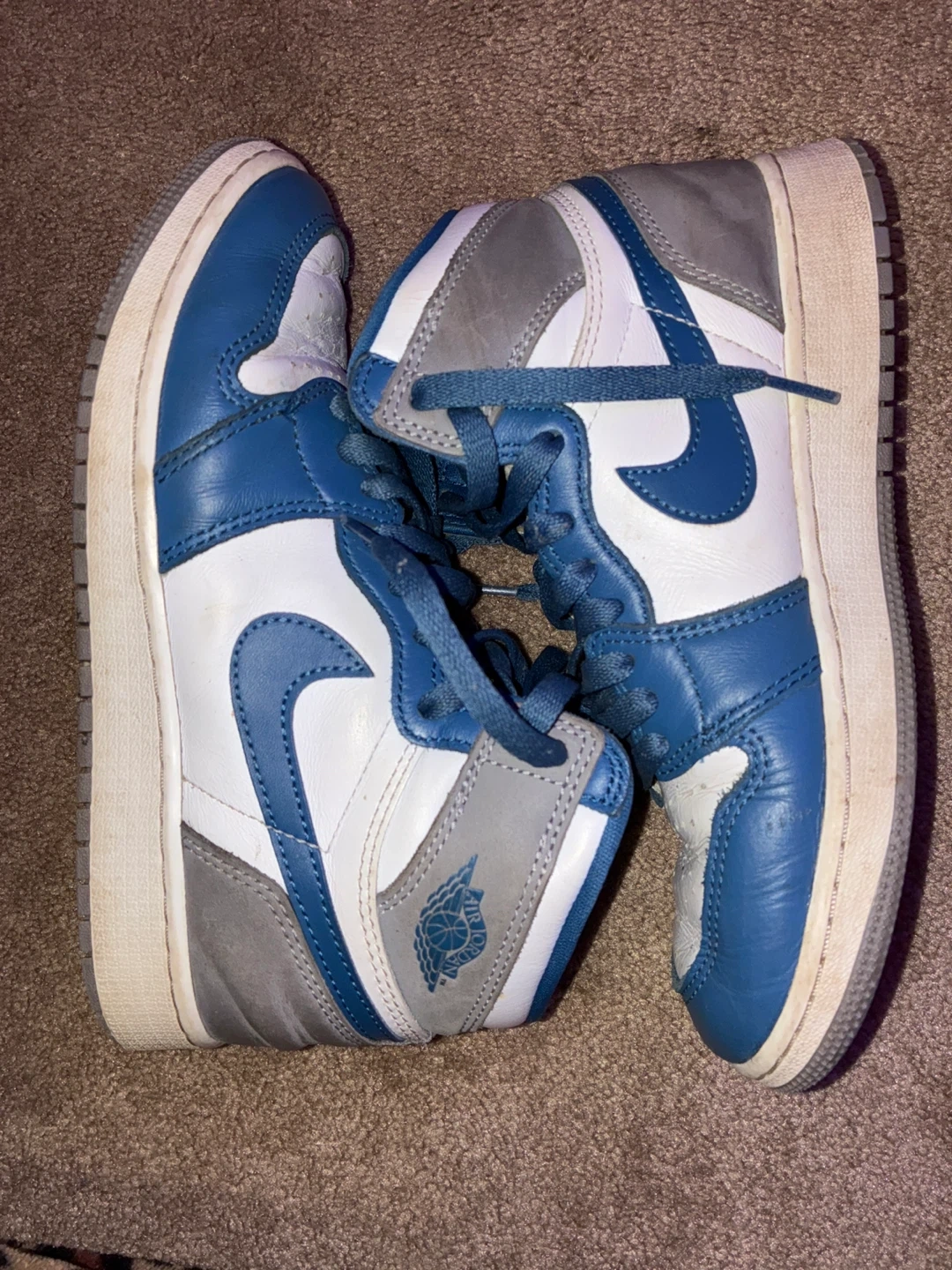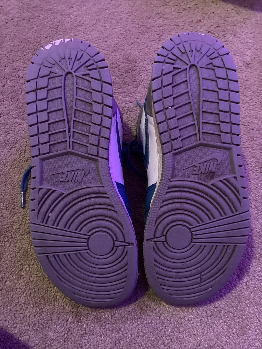 Selling a pair of Nike Air Jordan 1 High sneakers in a striking blue and white colourway! These shoes have the classic Nike Air logo and design. They show some signs of wear, but still have plenty of life left in them. Perfect for adding a pop of colour to your wardrobe!