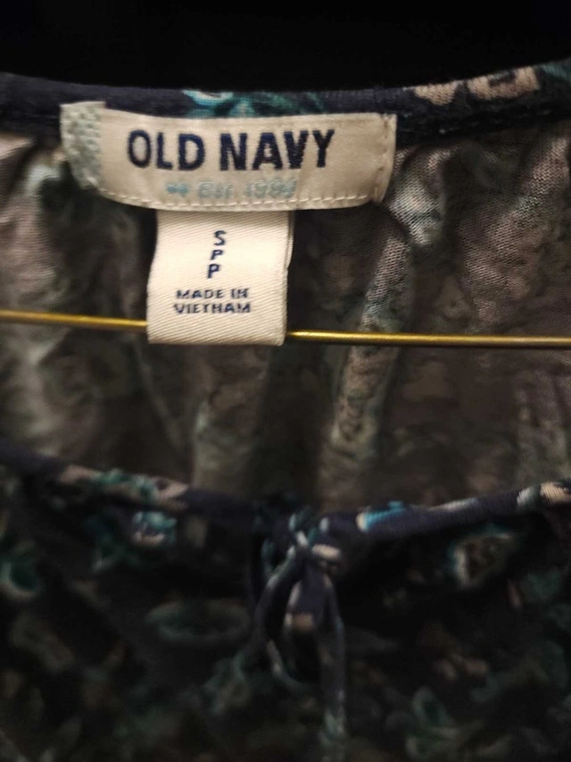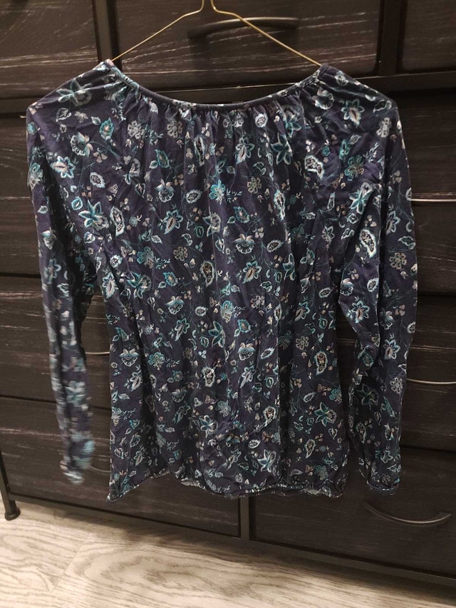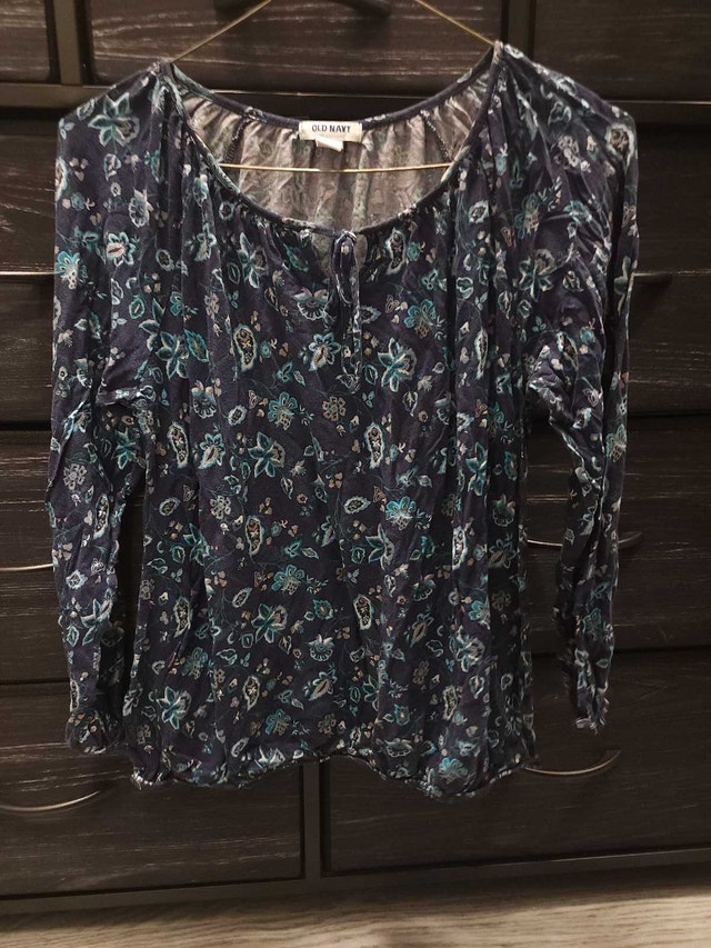 This is a lovely Old Navy floral long-sleeved top in size small. The top is made of a soft, lightweight material and features a beautiful blue and green floral pattern. It has a comfortable fit and is perfect for everyday wear. This item is in good condition, ready to add a touch of elegance to your wardrobe. Specifics: * Brand: Old Navy * Size: Small * Colour: Blue/Green Floral * Sleeve Length: Long Sleeve Looking at similar tops , a reasonable price would be $10.00. If this ad is still up, then yes, it's still available! Several options for pick up location which can be arranged.