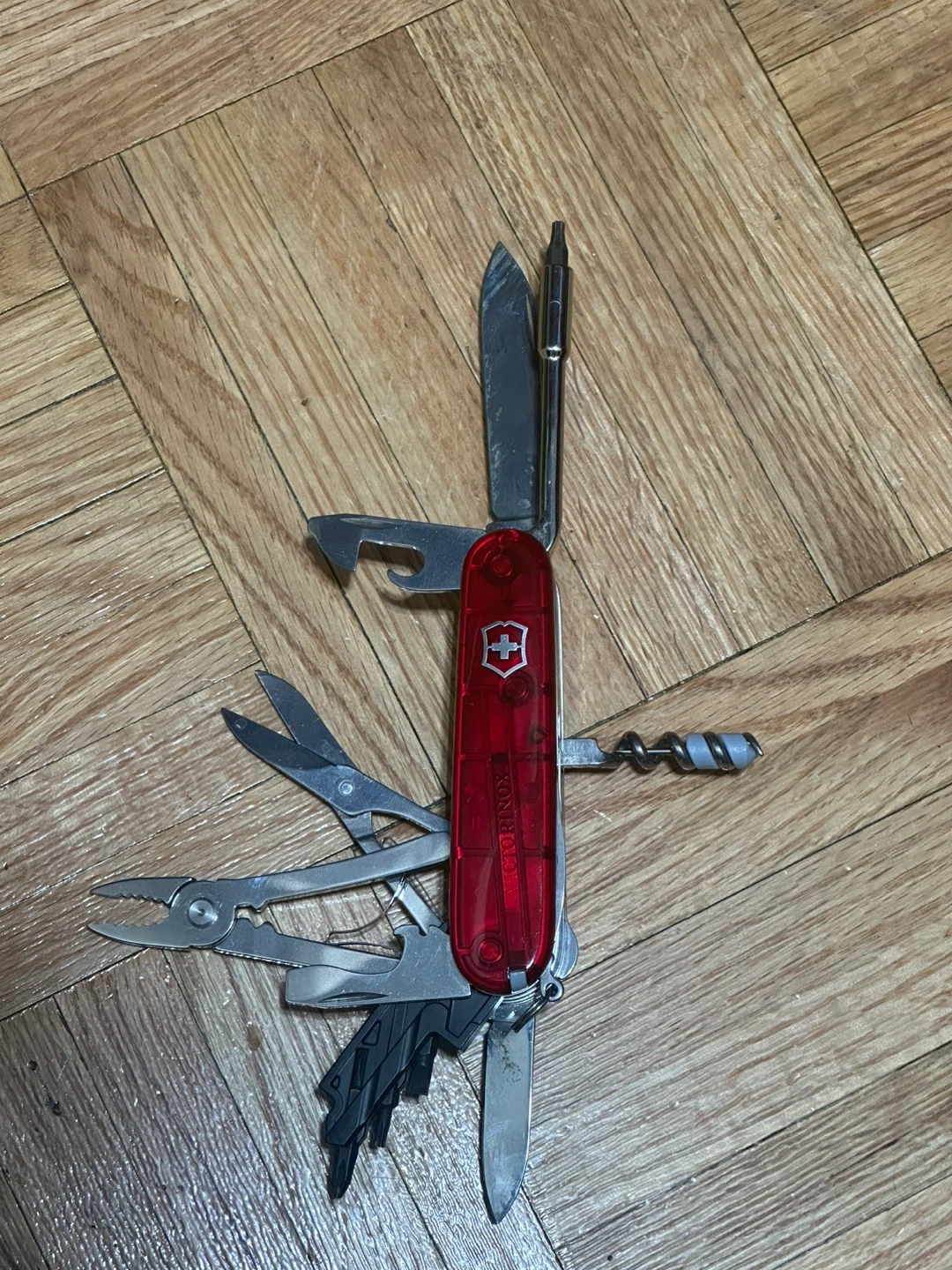 Selling a Victorinox Cybertool 34 Swiss Army Knife in translucent red. It's a versatile tool with many functions. Originally bought for $199.62. Great for anyone who needs a variety of tools in a compact package