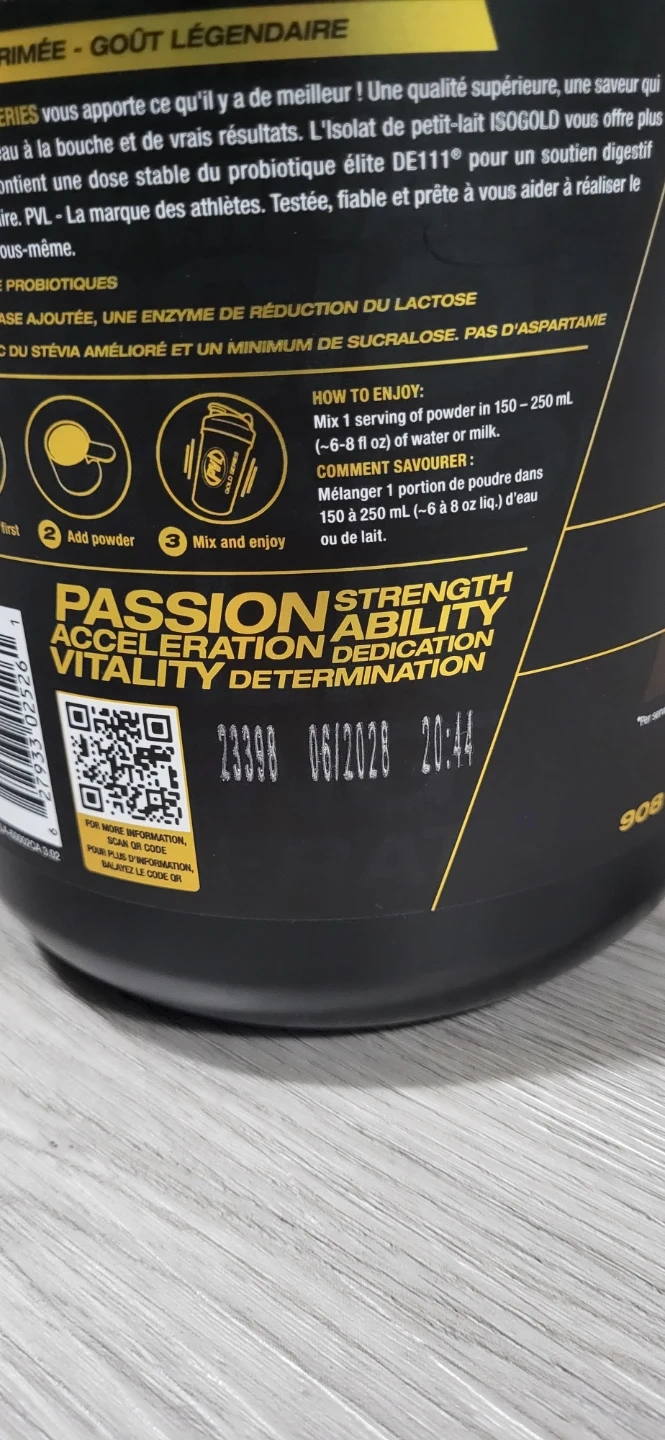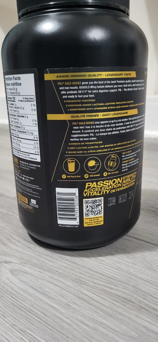 Selling a PVL Gold Series IsoGold 100% Whey Protein Isolate Shake in Triple Milk Chocolate flavour. The container is 908 g (2 lb). It also contains probiotic DE111. Expiry date is June 2028