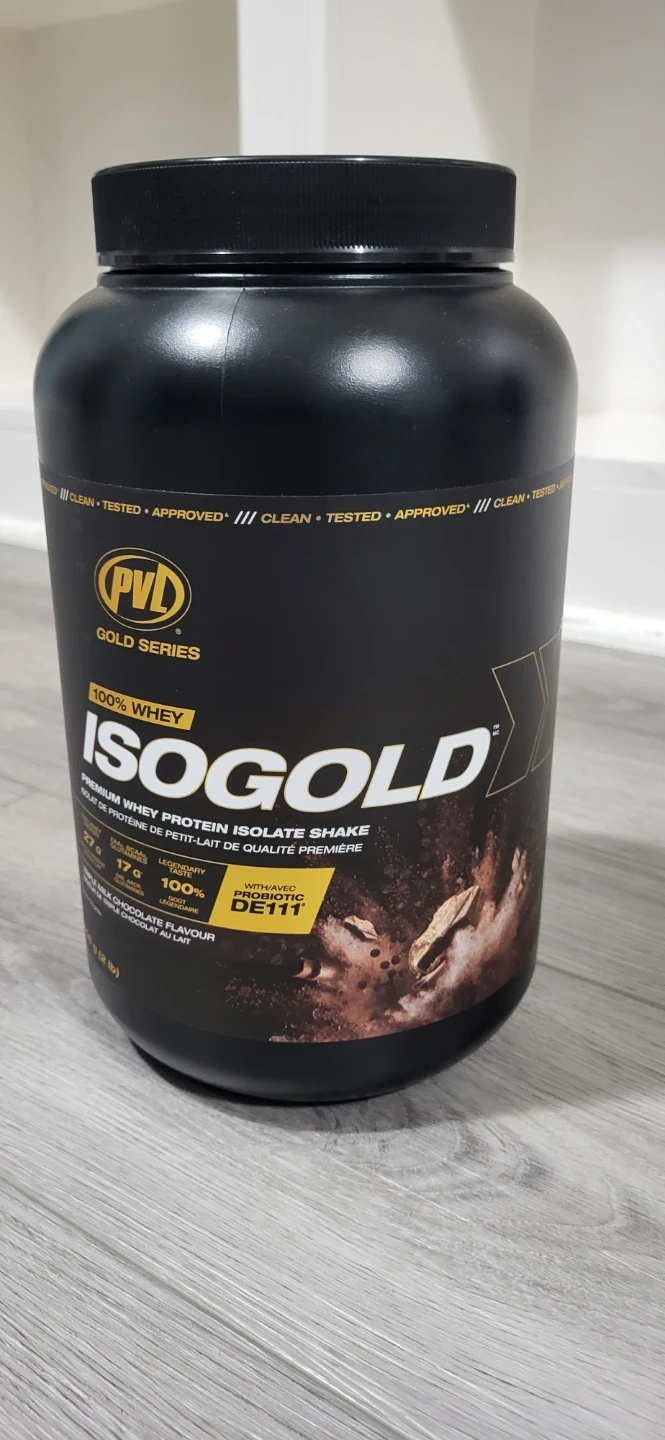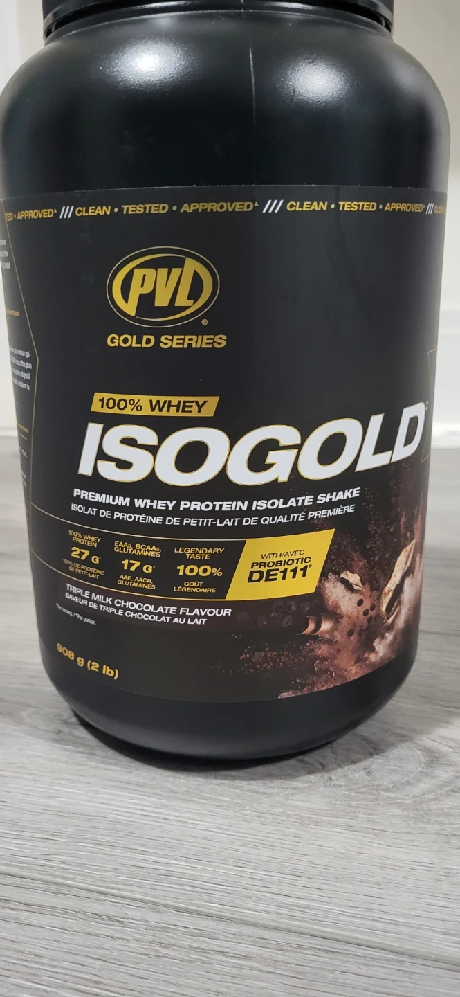 Selling a PVL Gold Series IsoGold 100% Whey Protein Isolate Shake in Triple Milk Chocolate flavour. The container is 908 g (2 lb). It also contains probiotic DE111. Expiry date is June 2028