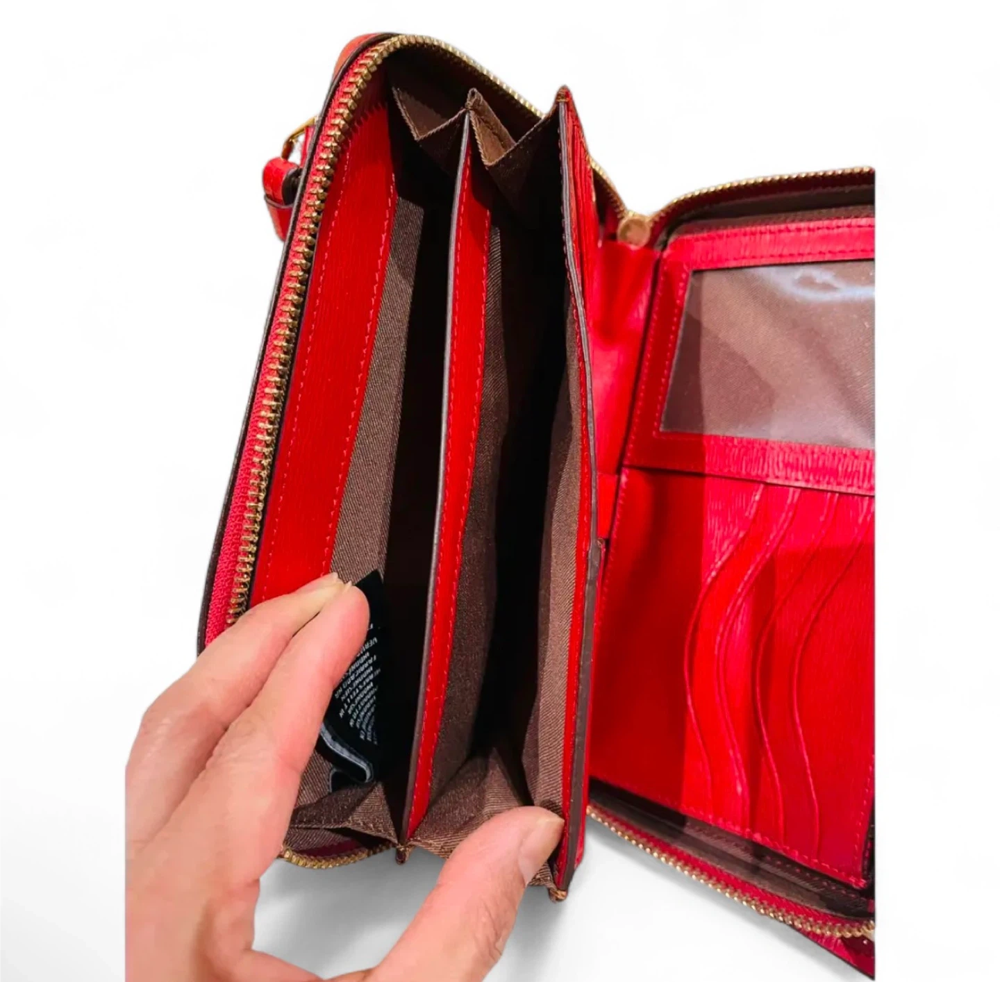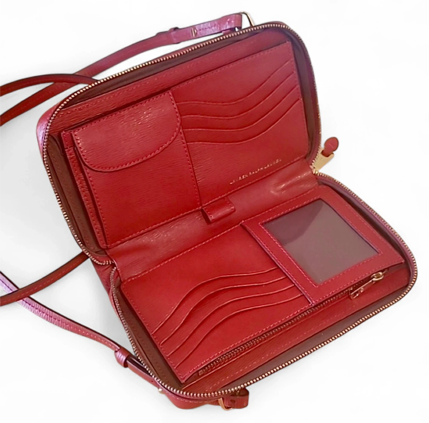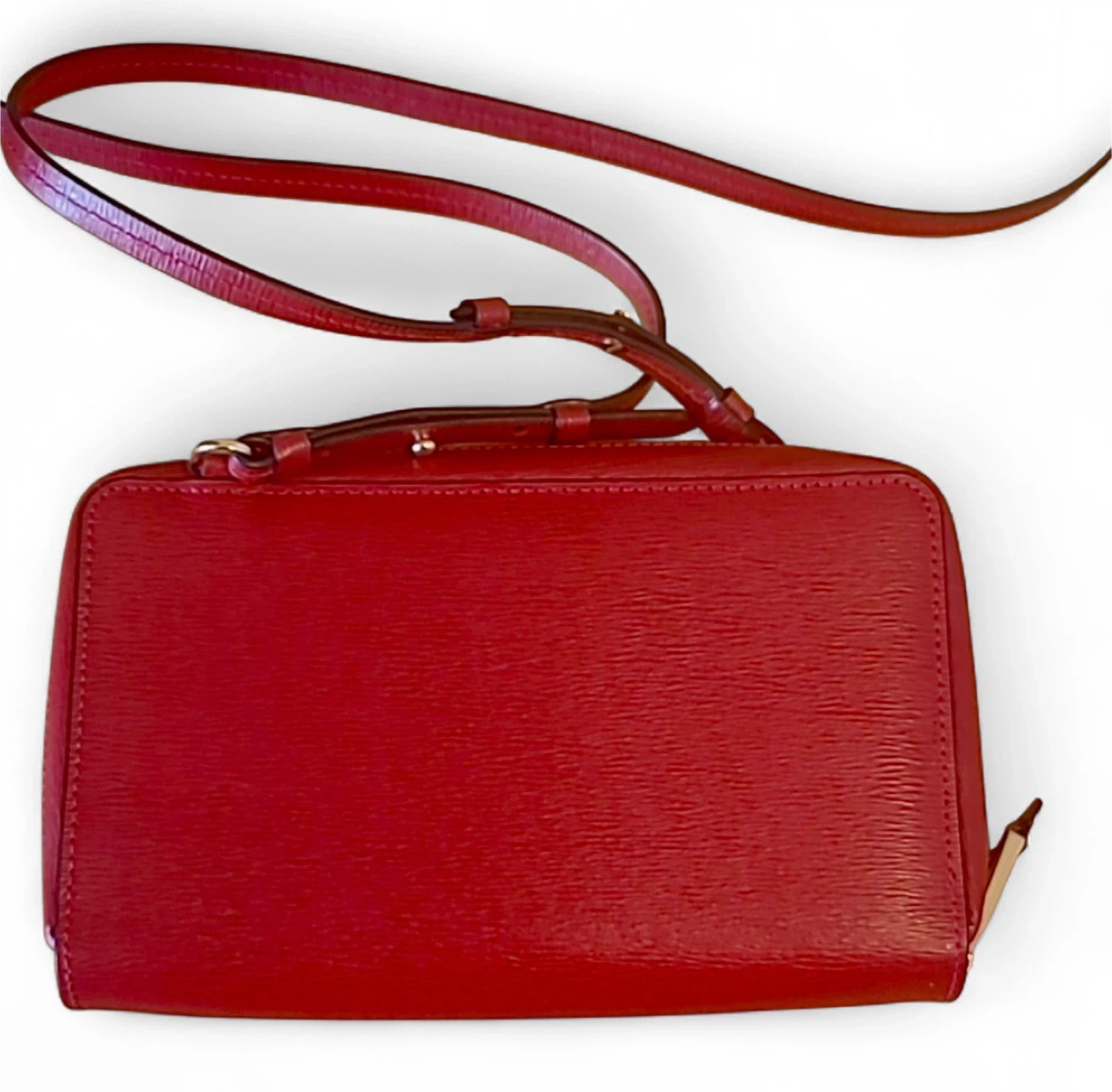 Used just a few times. Excellent condition. Beautiful compact bag. Crossbody with adjustable straps. Gorgeous red with gold hardware. No flaws to note. Lightweight.