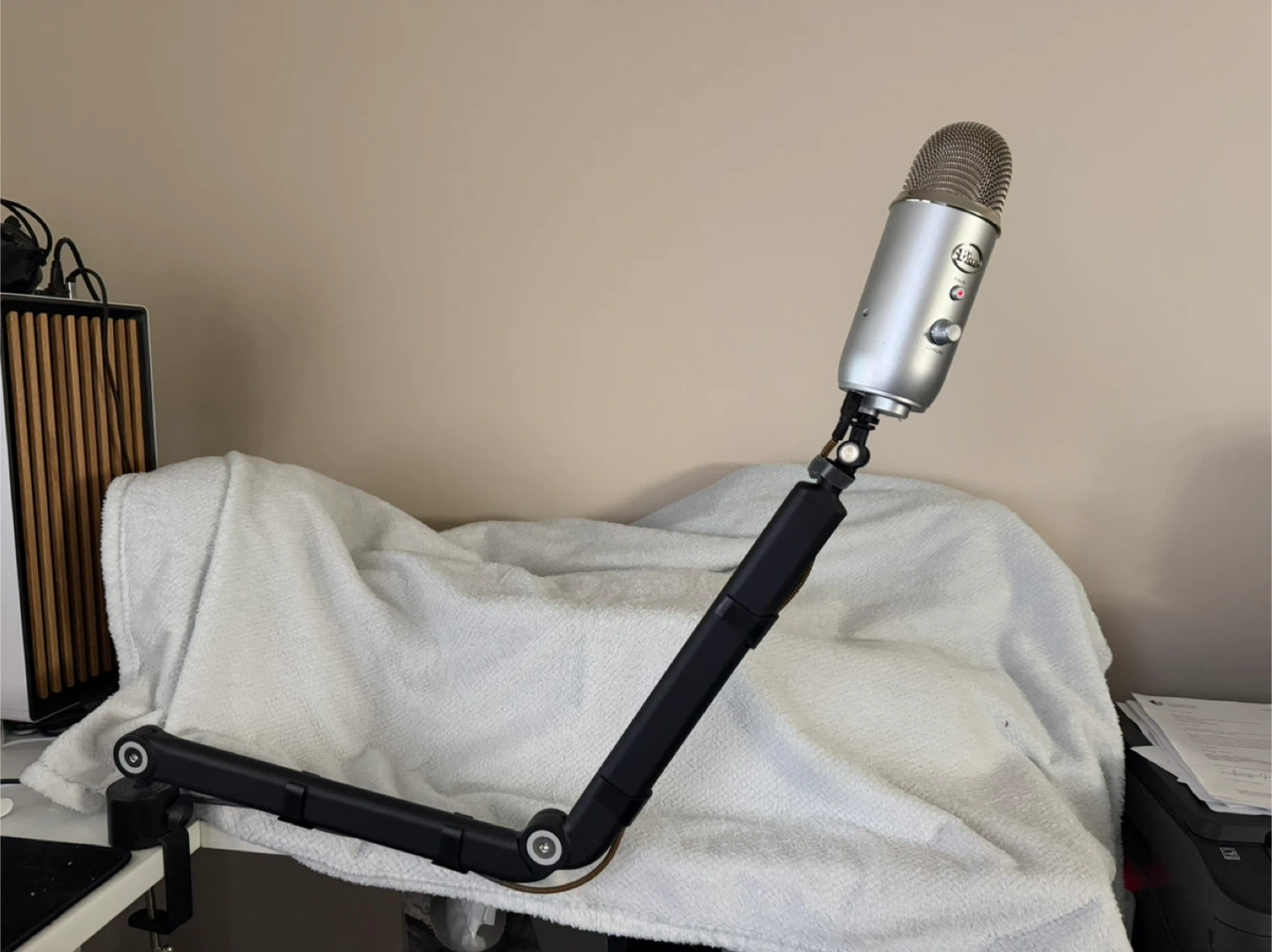 Selling a Blue Yeti USB microphone in silver (approx $160 new) and a compatible desk mount (approx $120). Barely used; was no longer compatible with my dictation program.
