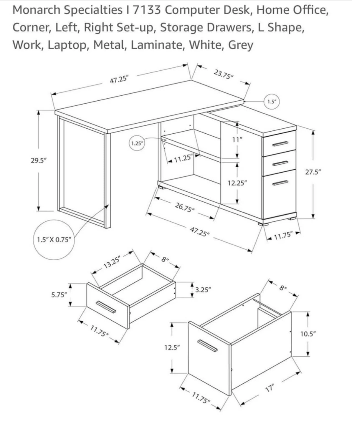 Selling a Monarch Specialties I 7133 computer desk, perfect for a home office setup! It's an L-shape design that can be set up for a corner, left, or right configuration. The desk includes storage drawers and is made of metal and laminate with a white and grey finish. Dimensions are 47.25" x 47.25" x 29.5"