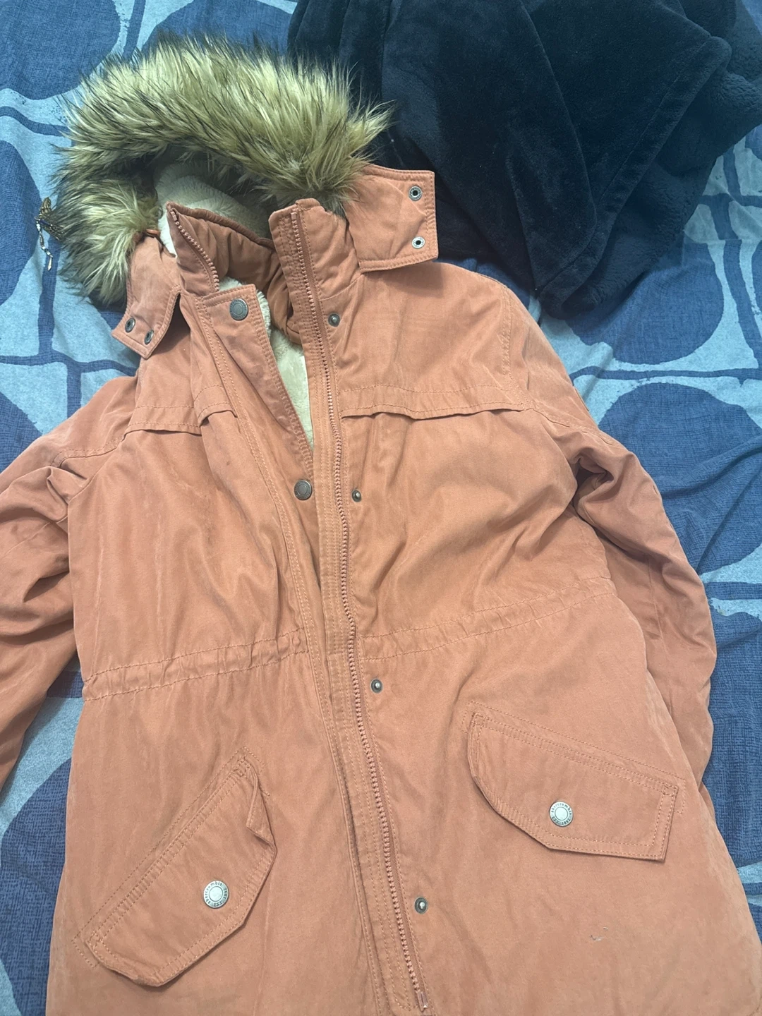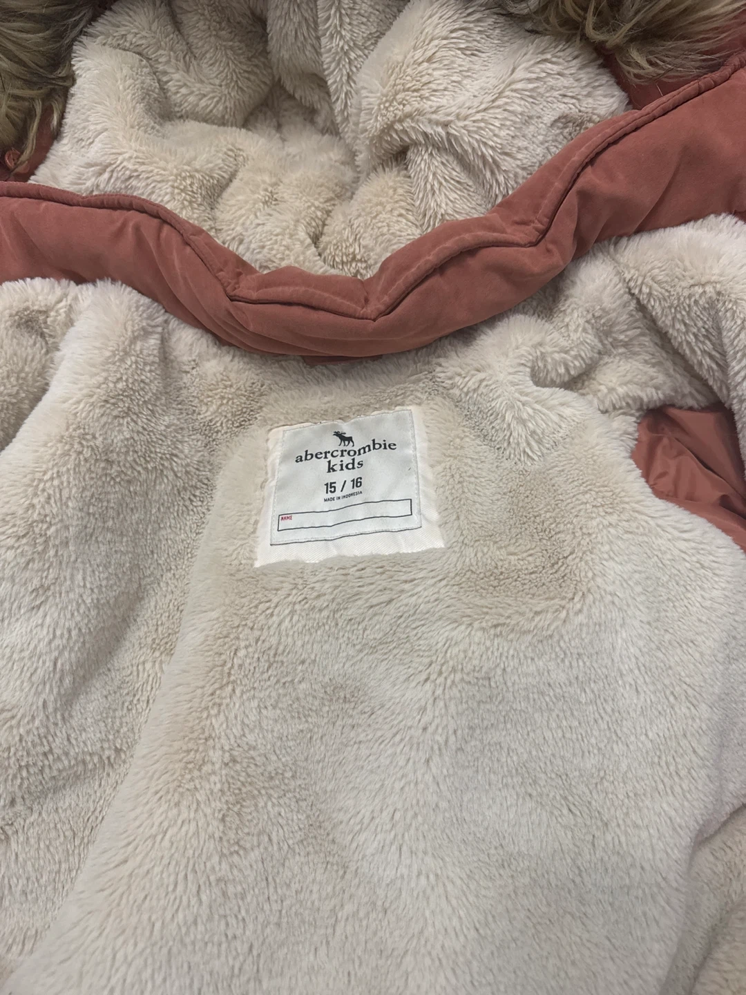 Cozy Abercrombie Kids winter parka in size 15/16! It's a lovely orange colour with a faux fur-trimmed hood and a soft, warm lining. Perfect for staying snug during those chilly Canadian winters