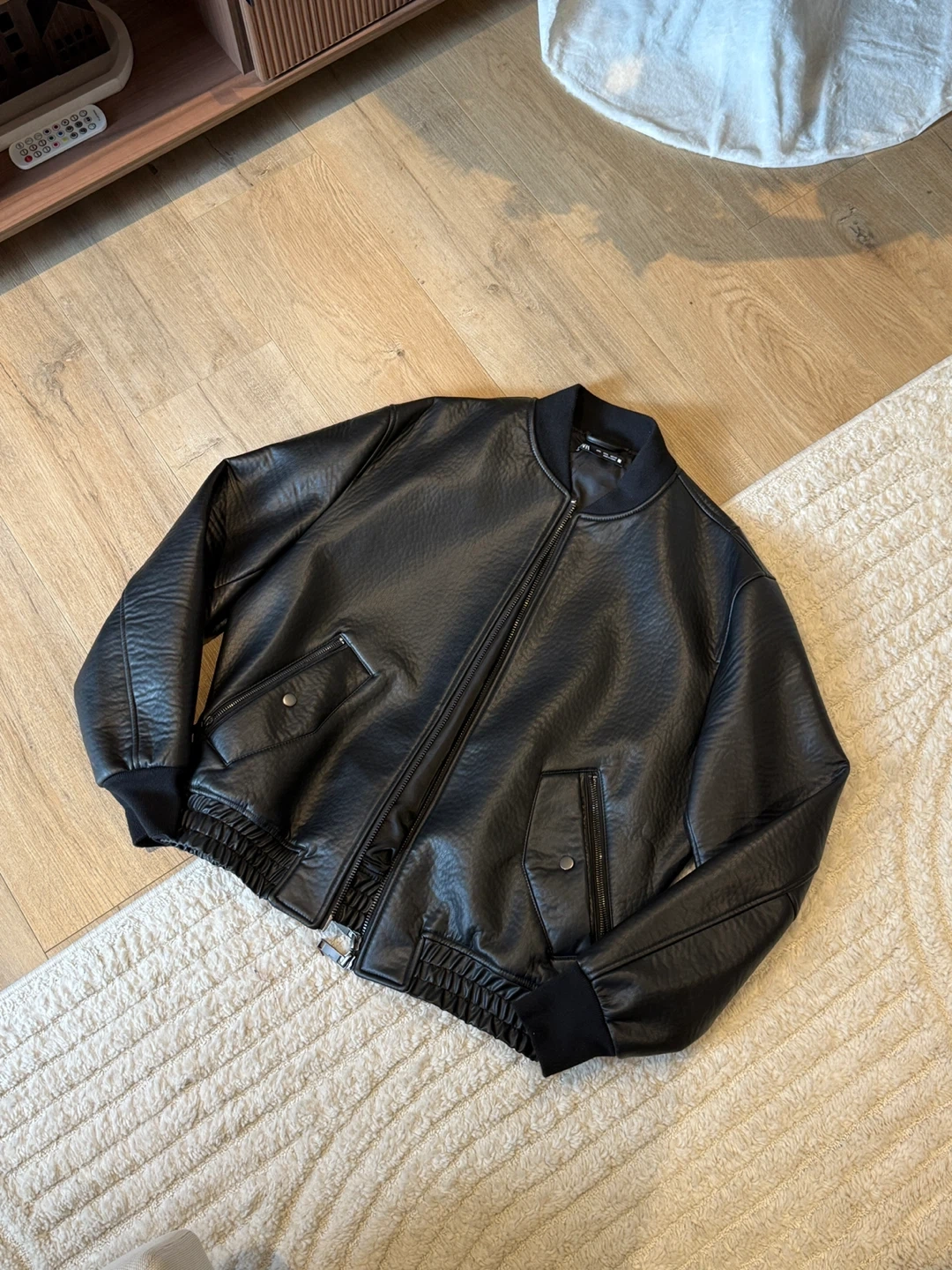 Selling a ZARA black faux leather bomber jacket in size L. This stylish jacket is in great condition and perfect for adding a touch of edge to any outfit. It features a classic bomber silhouette with ribbed cuffs and hem, a front zip closure, and functional pockets. A versatile piece for your wardrobe!