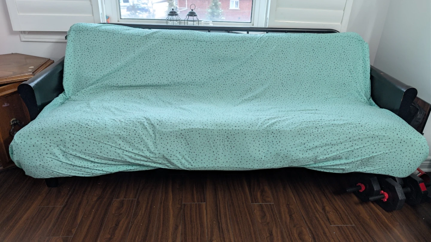 Selling a futon that's in great shape! It comes with a stylish mint green cover that adds a pop of colour to any room. Perfect for extra seating or a comfy guest bed.