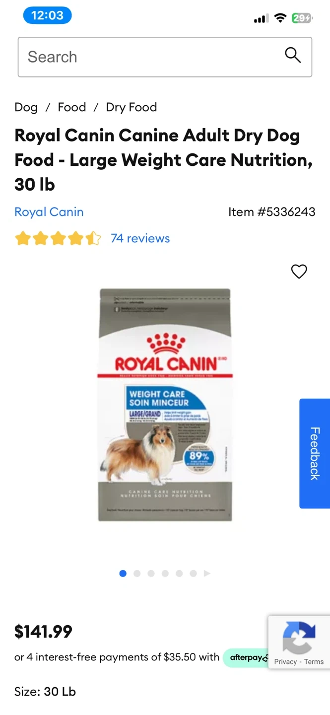 Selling a 30 lb bag of Royal Canin Canine Adult Dry Dog Food, specifically the Large Weight Care Nutrition formula! It's designed to help your dog maintain a healthy weight with a tailored blend of nutrients. Originally bought for $141.99