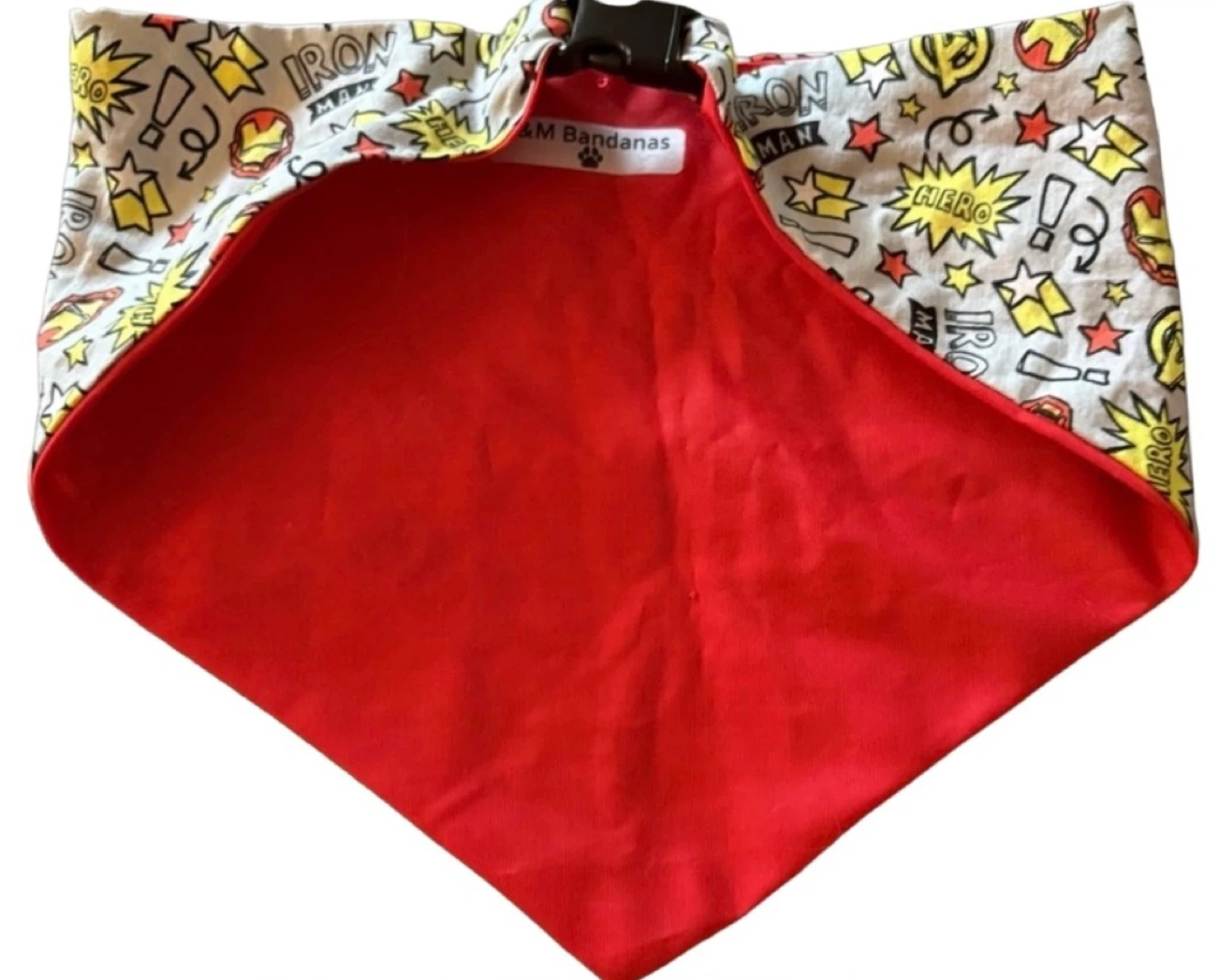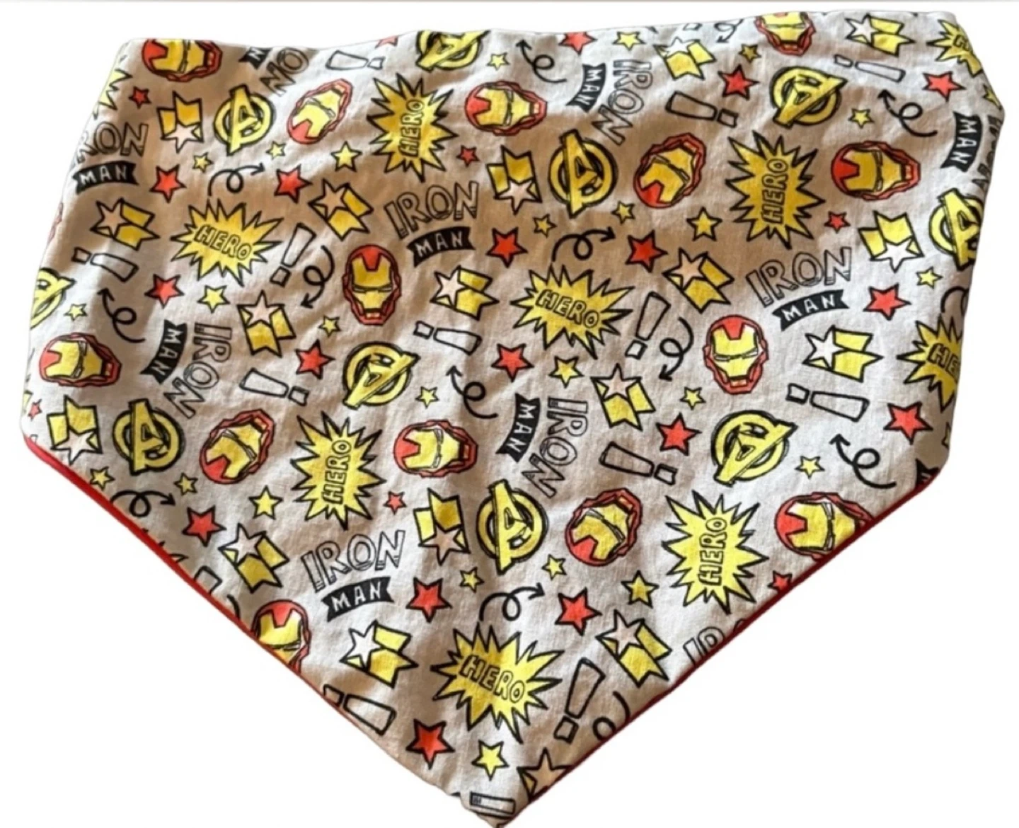-Hero Sketch: A fun, comic-inspired "Iron Man" and "Avengers" theme on a neutral cream background. Size: Fits necks up to 21″ – ideal for medium to large breeds like Boxers, Aussies, and Spaniels