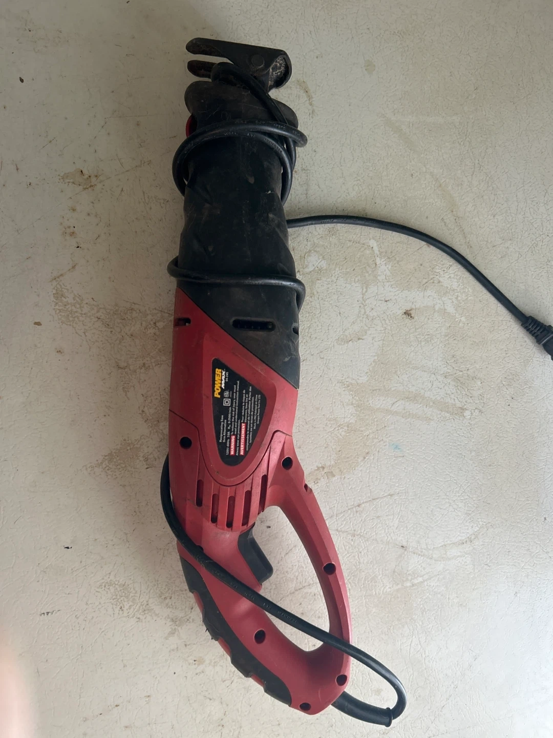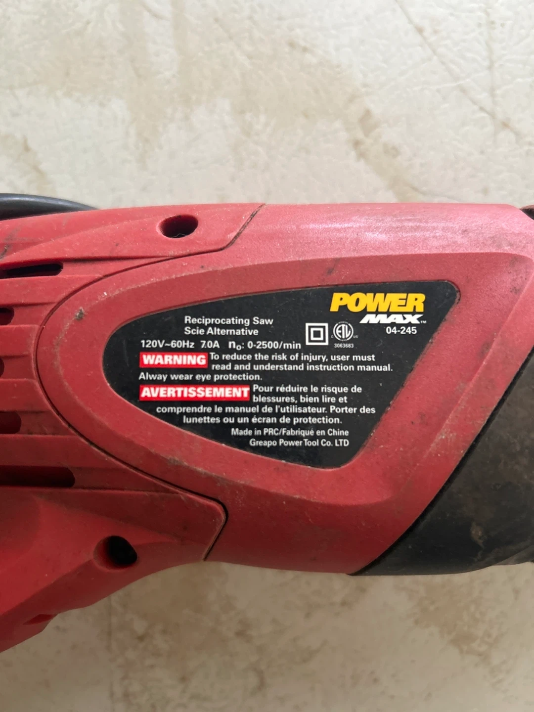 Selling a Power Max reciprocating saw. It operates at 120V-60Hz and 7.0A, with a no-load speed of 0-2500/min. Always remember to wear eye protection and read the instruction manual before use!