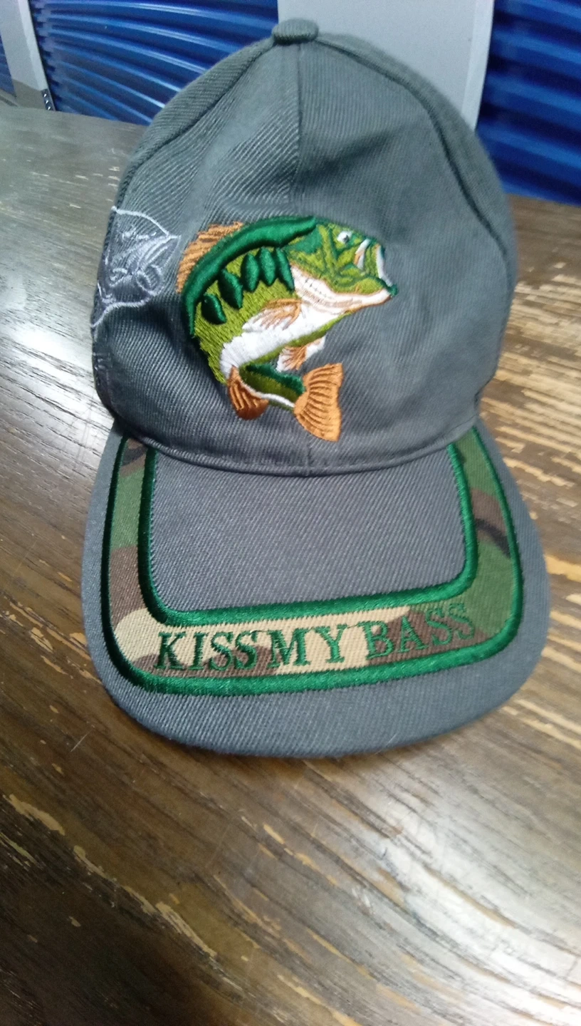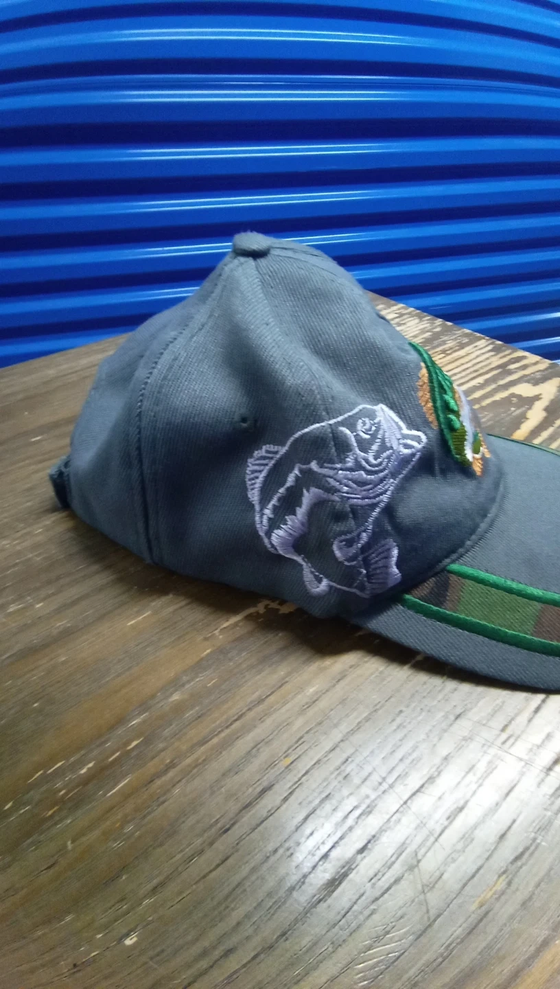 Selling a gray baseball cap. It features a fish embroidery design. The hat is made of 80% cotton and 20% polyester.