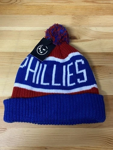 The NWT '47 Brand Philadelphia Phillies Wordmark Script Blue Red Beanie Pom Knit Hat is an officially licensed Major League Baseball cap featuring the iconic Philadelphia Phillies team logo. This unisex adult-sized hat is in a vibrant blue color with red accents, perfect for showing support for your favorite baseball team during the regular season. The knit design and pom pom on top add a stylish touch to this must-have accessory for fans of the Phillies.