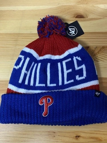 The NWT '47 Brand Philadelphia Phillies Wordmark Script Blue Red Beanie Pom Knit Hat is an officially licensed Major League Baseball cap featuring the iconic Philadelphia Phillies team logo. This unisex adult-sized hat is in a vibrant blue color with red accents, perfect for showing support for your favorite baseball team during the regular season. The knit design and pom pom on top add a stylish touch to this must-have accessory for fans of the Phillies.