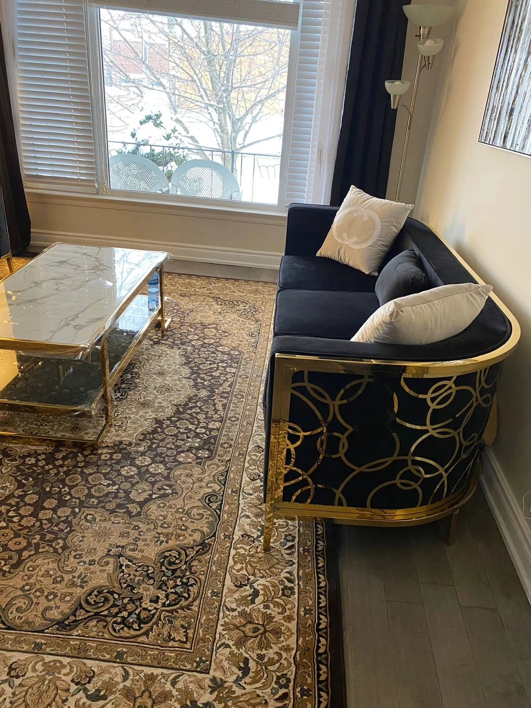 Selling a stylish black velvet sofa set with elegant gold trim. This set includes a sofa and a loveseat, perfect for adding a touch of luxury to your living space. The cushions feature a subtle design. It's in great condition and ready to enhance your home!