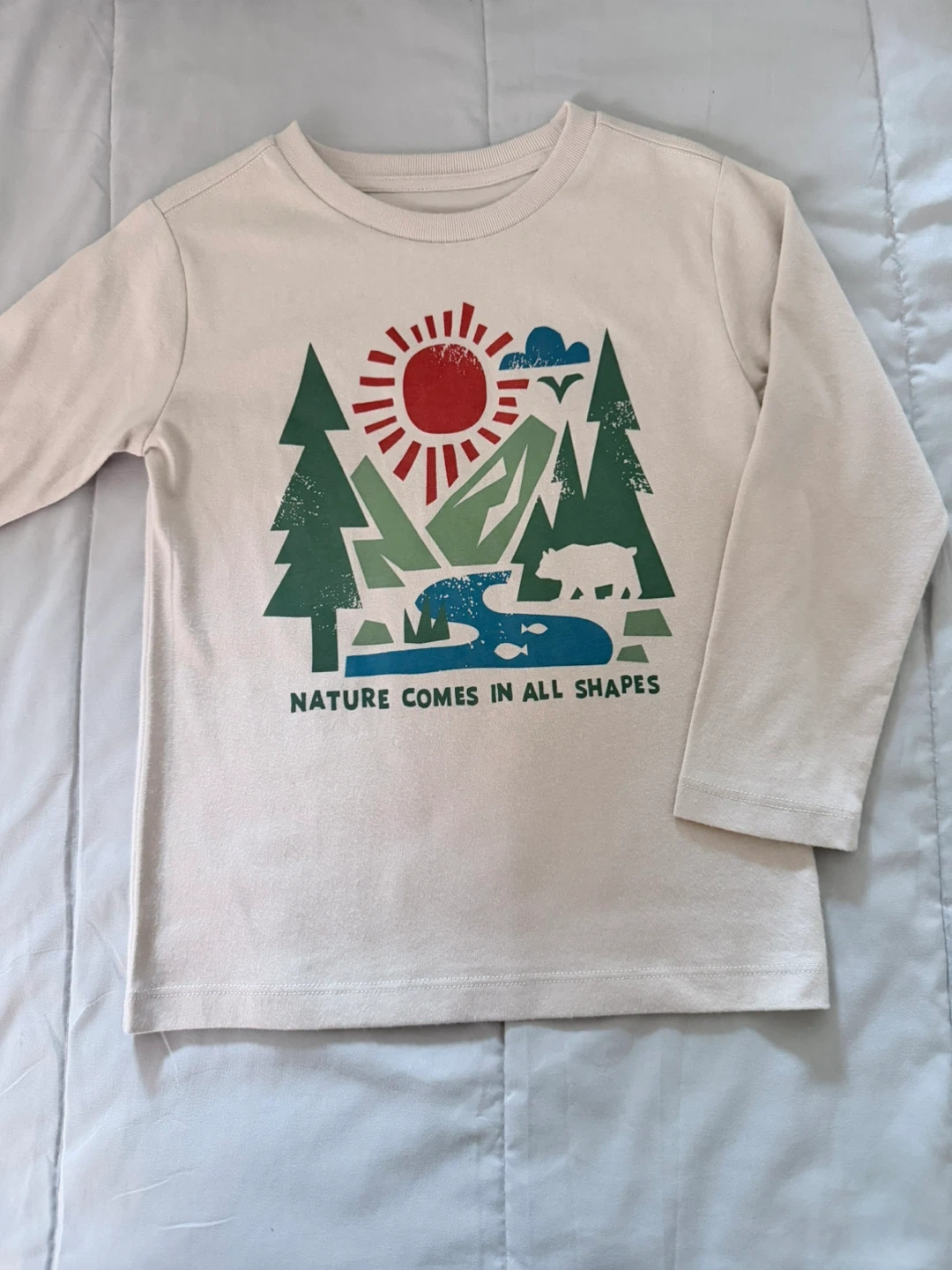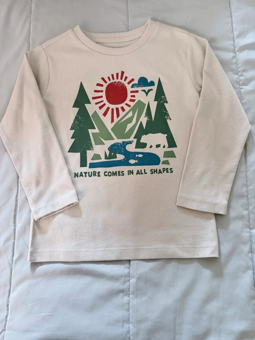 Cute long sleeve shirt for kids with a nature scene design. It features trees, a sun, mountains, and a bear. Perfect for everyday wear!