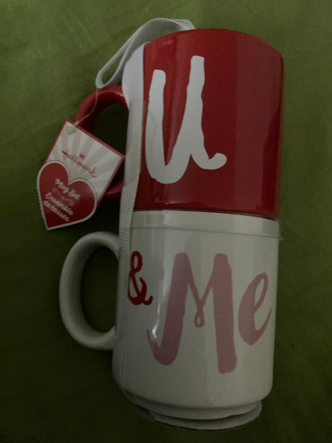 Selling a cute Hallmark mug set that includes two mugs, one red and one white, with 'U & Me' written on them. Perfect for couples or anyone who loves a good cuppa!
