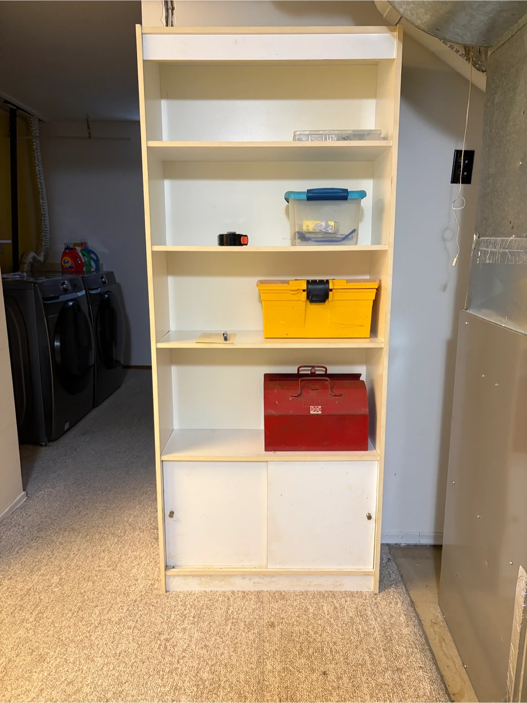 Selling a white bookshelf with sliding doors at the bottom. It has some wear and tear, but it's solid and still functional and has lots of storage space. Great for organizing books, tools, or anything else you need to store