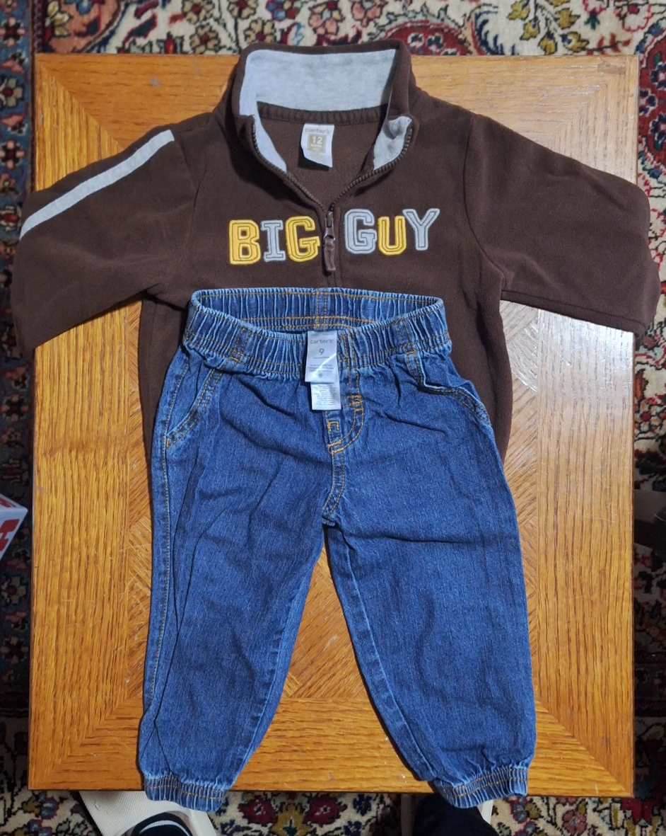 Here's a cute Carter's outfit for your little one! It includes a brown pullover with a "BIG GUY" design and a pair of denim jeans. The pullover is size 12 months, and the jeans are size 9 months. Both are in great condition and ready for a new adventure!