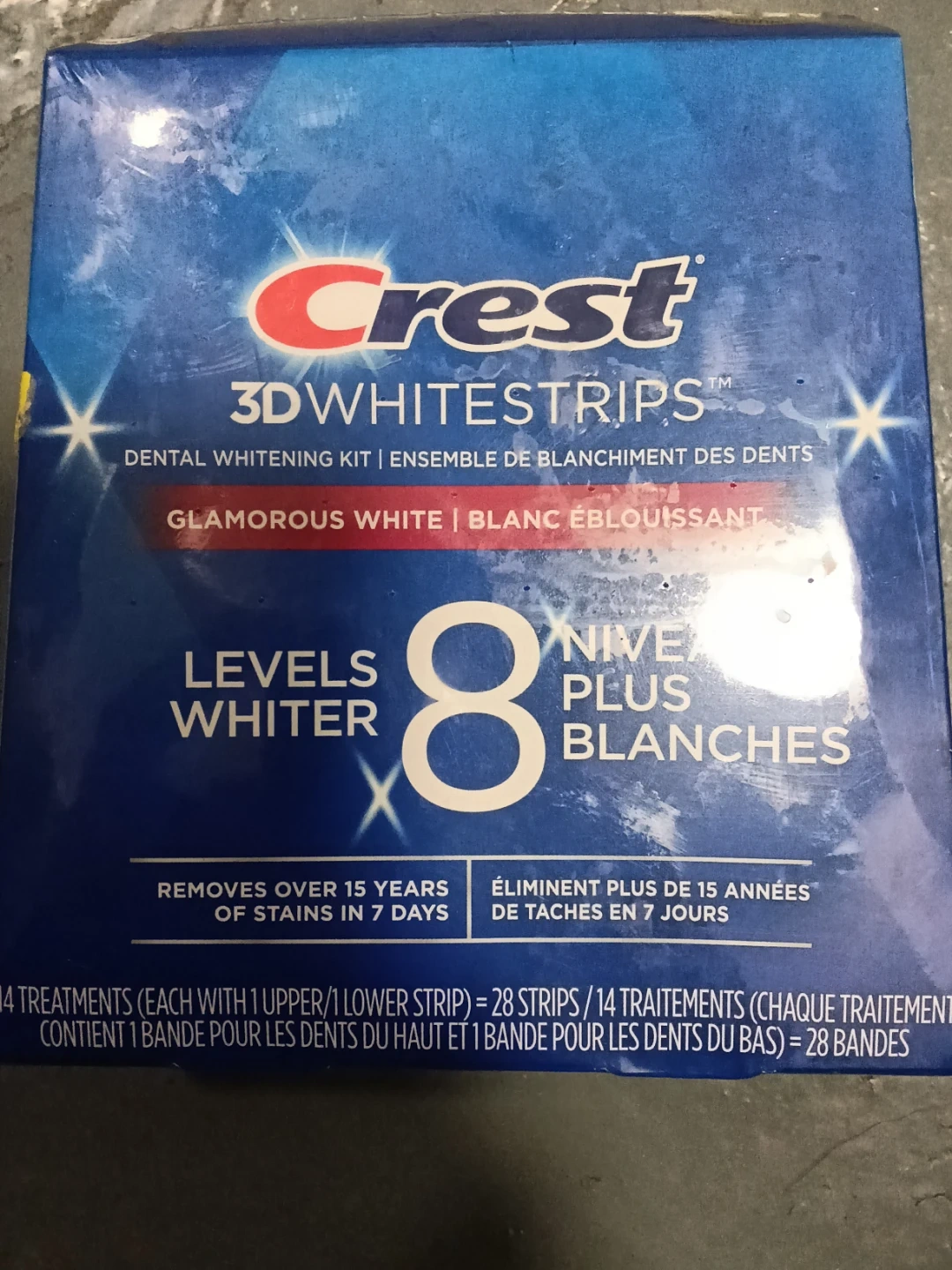 Selling a brand new box of Crest 3D Whitestrips in Glamorous White! This dental whitening kit comes with 14 treatments, which equals 28 strips (14 for the upper teeth and 14 for the lower teeth). Get ready to remove over 15 years of stains in just 7 days