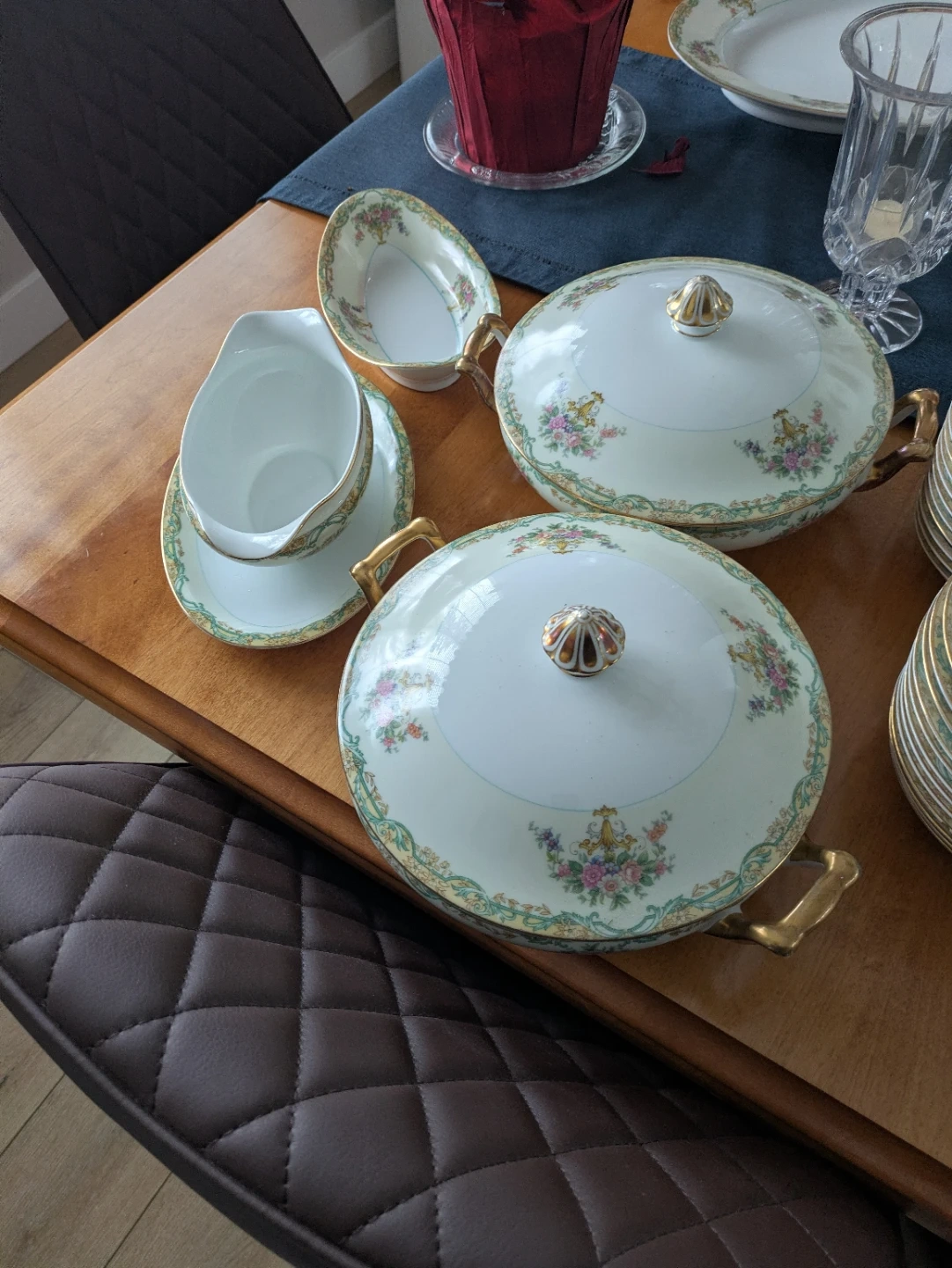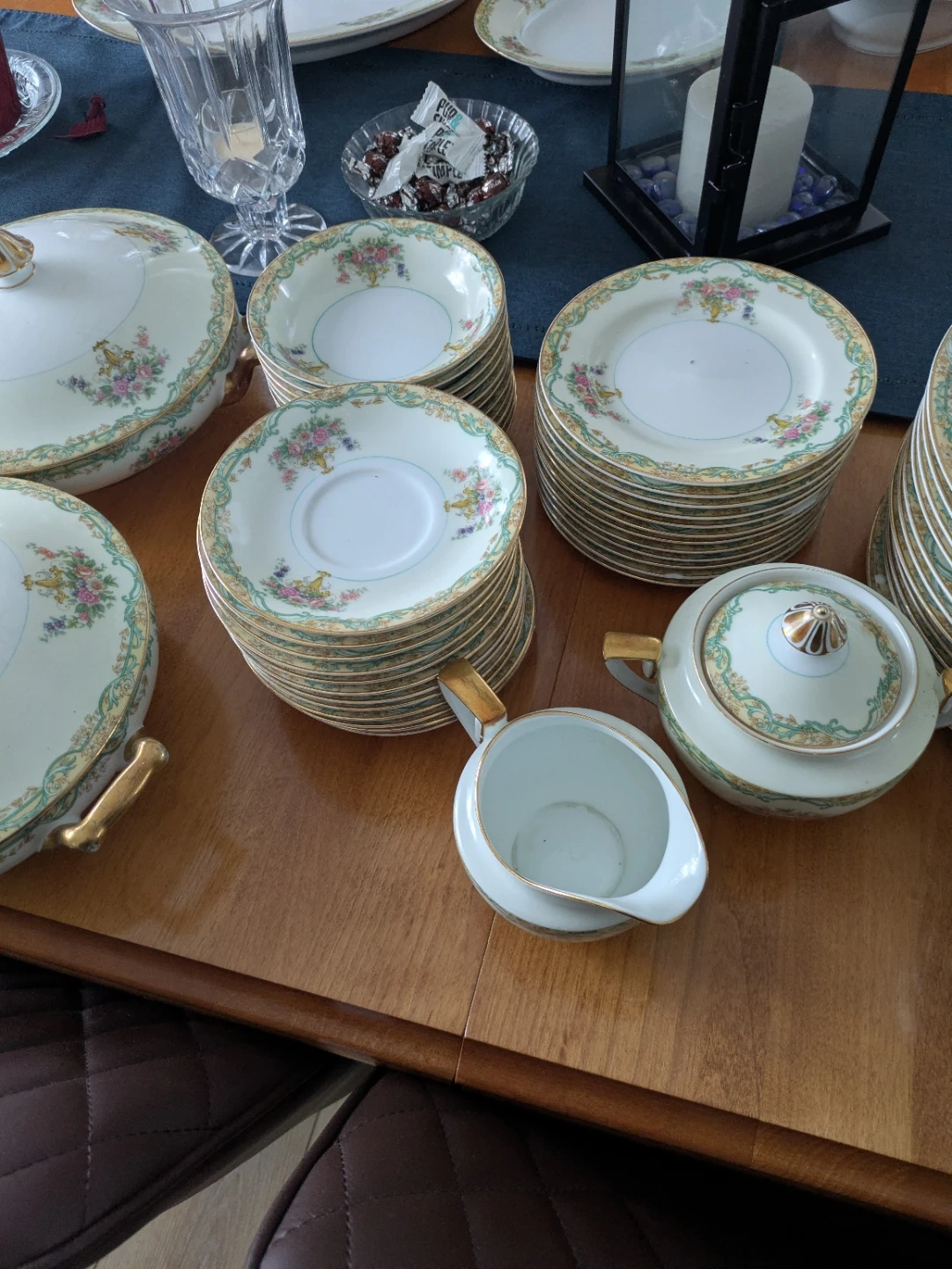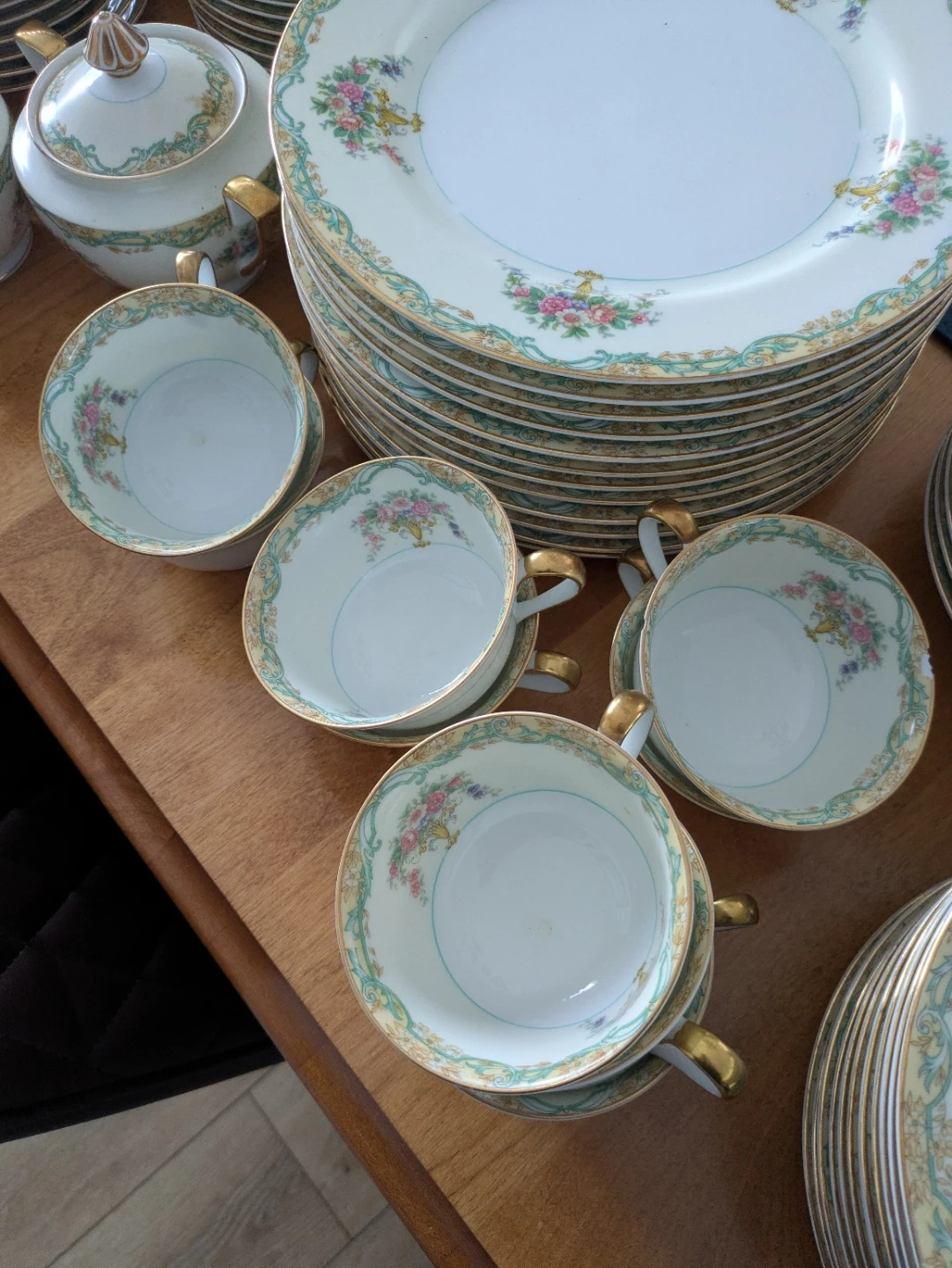 Selling a beautiful vintage china set with a delicate floral pattern and gold trim. This set includes plates, bowls, cups, saucers, and serving dishes. It's perfect for adding a touch of elegance to your dining experience! Noritake Arvana China - 12 piece place setting includes dinner plates, bread and butter plates, dessert bowls, teacups, saucers, soup bowls, gravy boat, 2 serving bowls with lids, sugar bowl, creamer, large platter, medium platter, small platter and medium serving bowl. 2 teacups damaged. Minor chips.