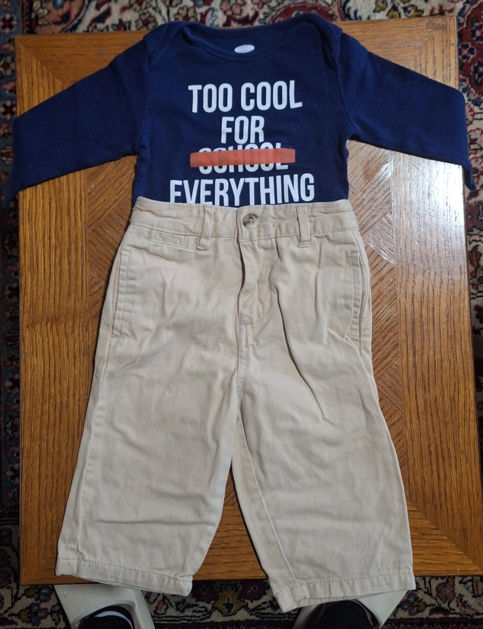 A cute little outfit for your little one! This Old Navy set includes a long-sleeved bodysuit with a fun 'TOO COOL FOR EVERYTHING' print and a pair of khaki-coloured shorts. Perfect for a casual day out or playtime!