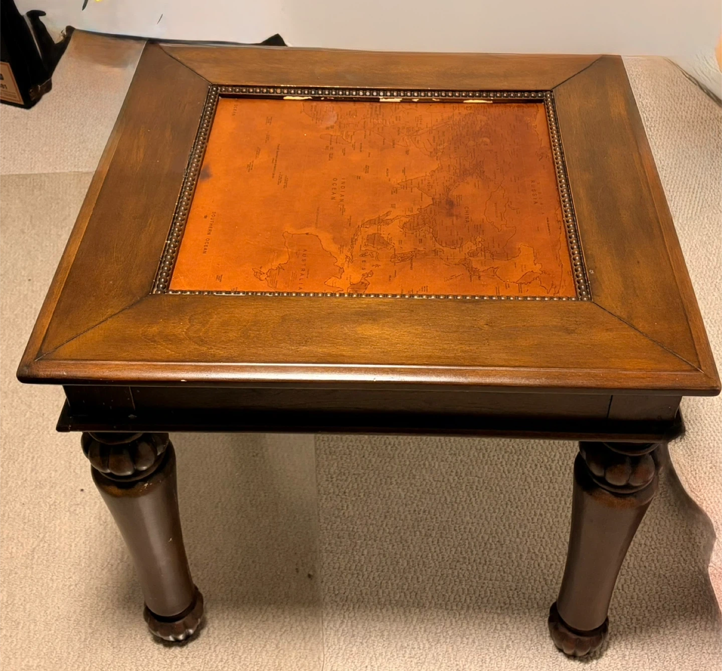 This is a beautiful accent table featuring a world map design on top. It's in great condition and would be a lovely addition to any room. The table has a wooden frame with a dark brown finish, adding a touch of elegance to your space. Two side tables are available for sale. ($10 each)