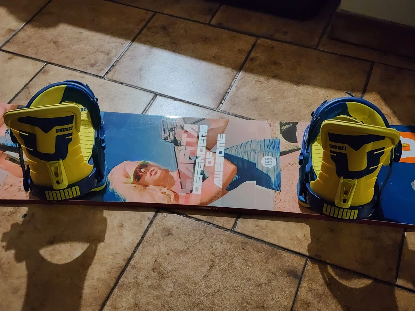 Selling a Capita Defenders of Awesome snowboard, size 156. It comes with Union Contact bindings in blue and yellow. Ready to hit the slopes!