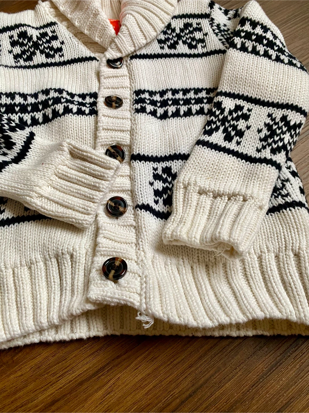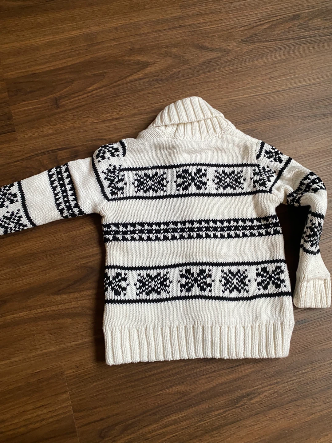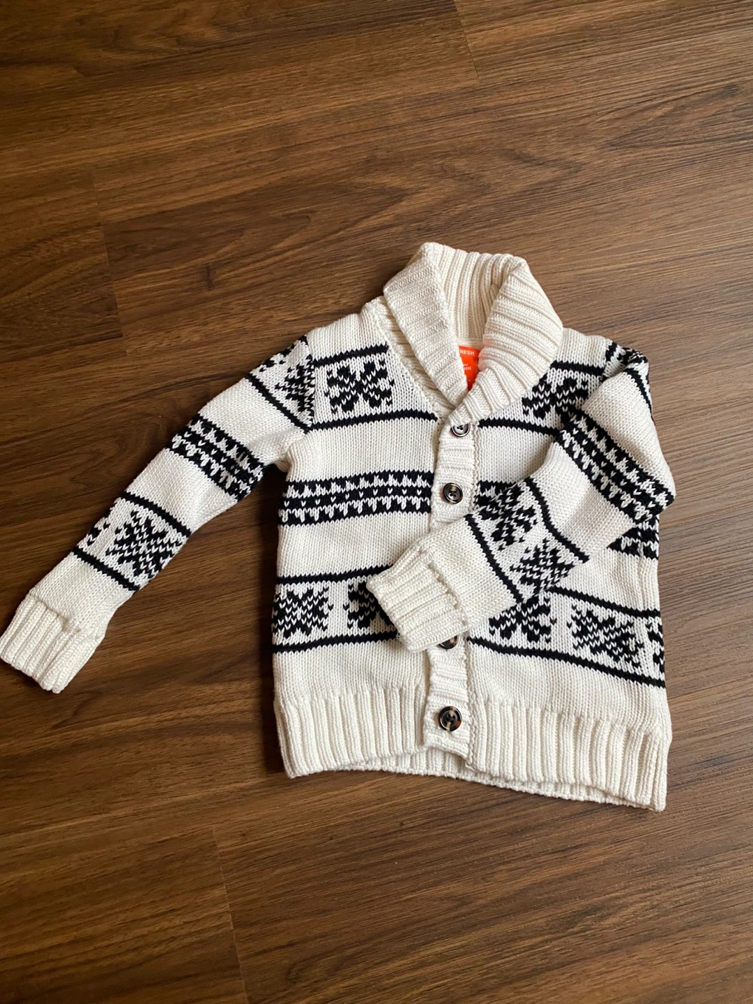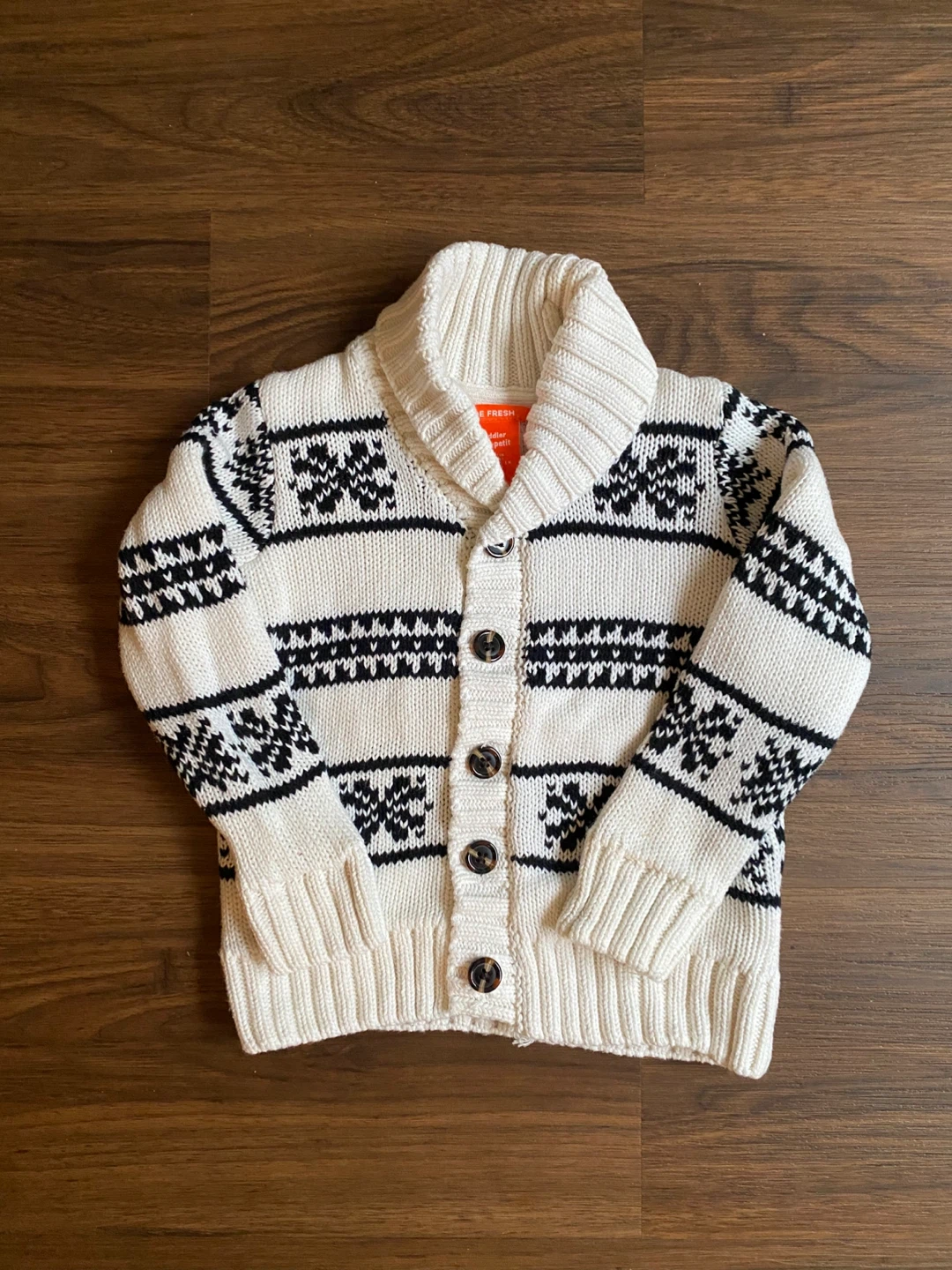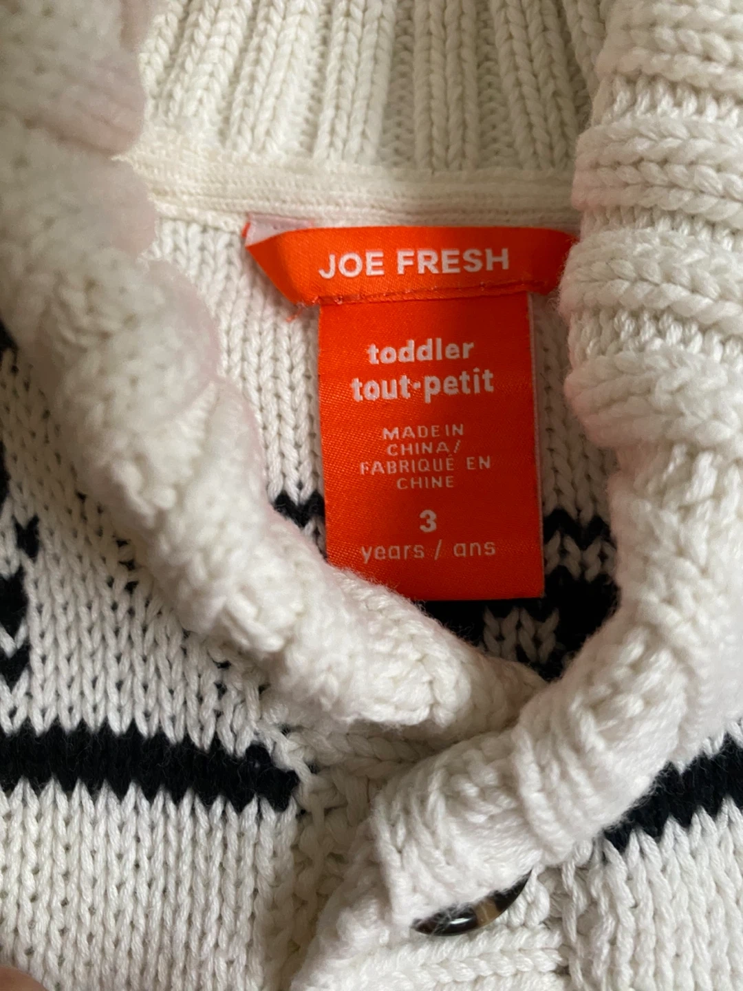 A cozy Joe Fresh knit cardigan for toddlers, perfect for layering! It's a size 3 and features a lovely knit snowflake pattern in cream and black. Great for keeping your little one warm and stylish this winter cold season