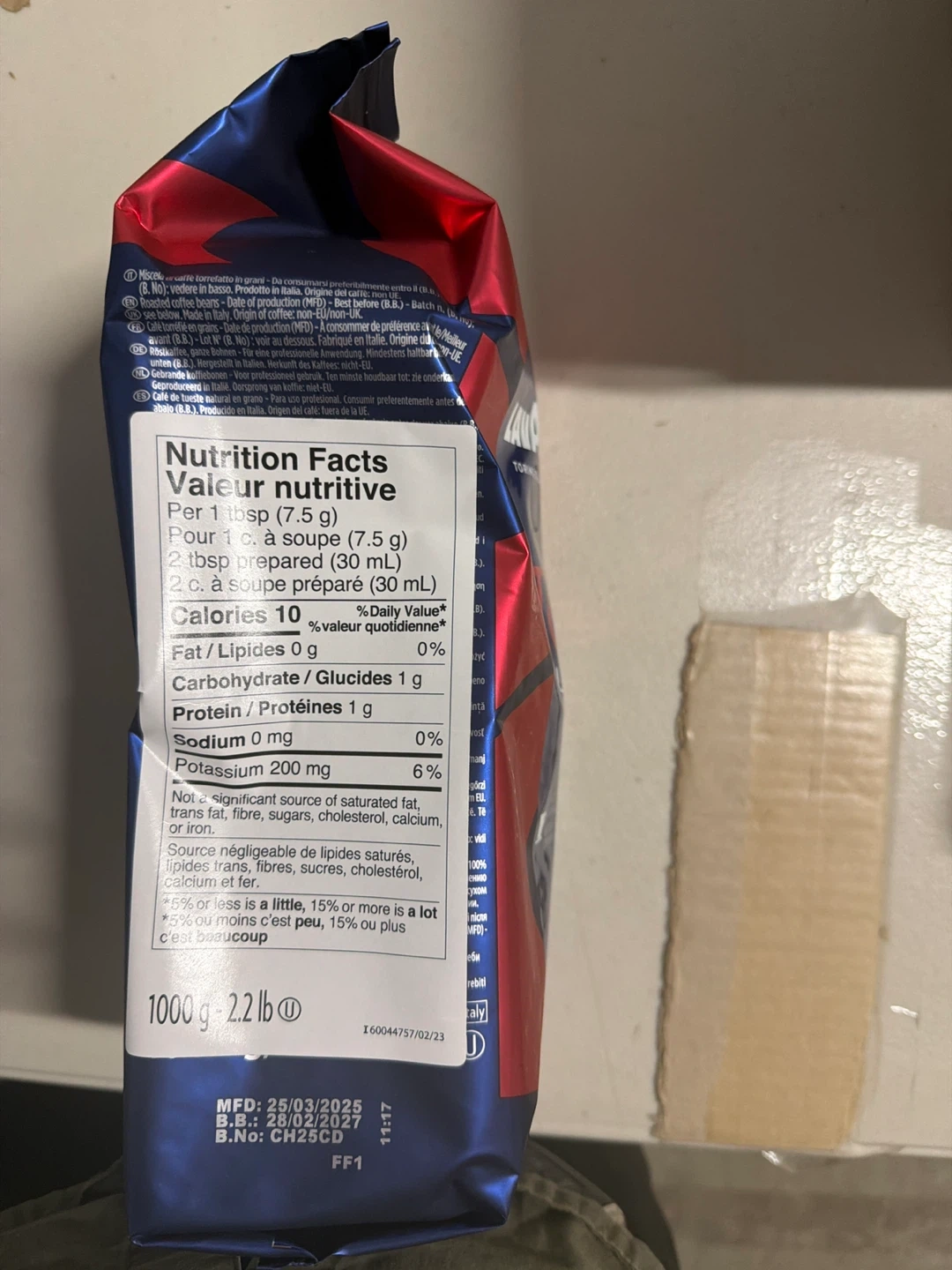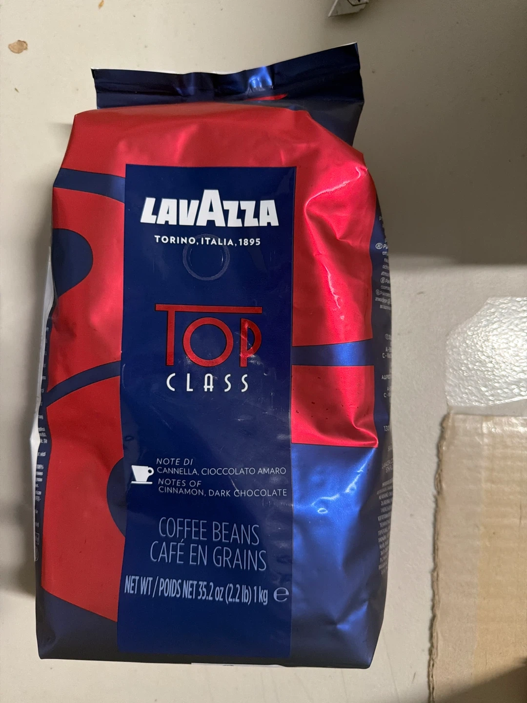 Selling a 1 kg (2.2 lb) bag of Lavazza Top Class coffee beans! They're coffee beans with notes of cinnamon and dark chocolate. The manufacturing date is 2023 March 25, and the best before date is 2027 February 28