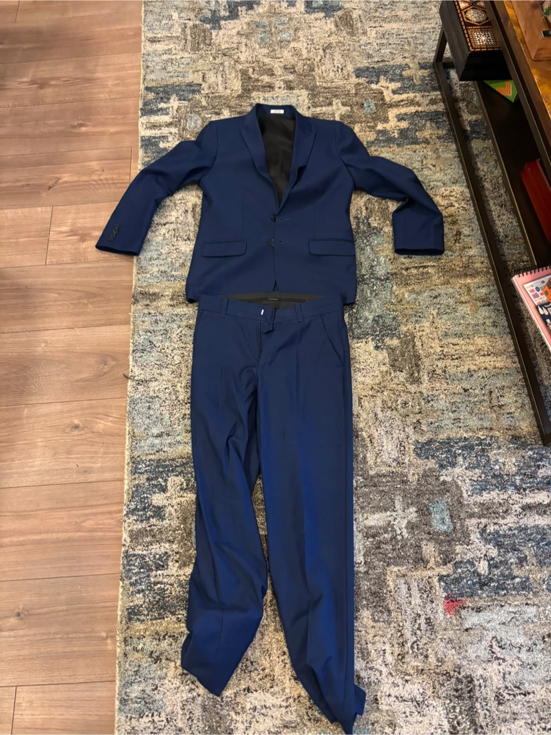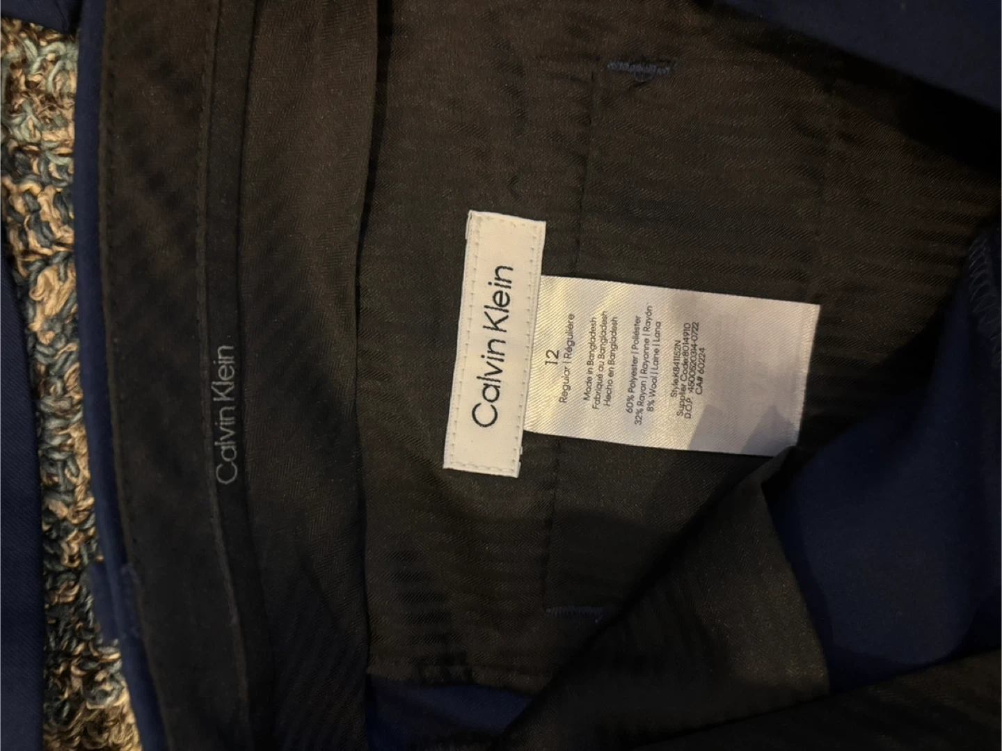 Selling a Calvin Klein blue suit in size 12. The suit is made of 62% polyester, 32% rayon, and 6% wool. It's in great condition and ready for a new owner!