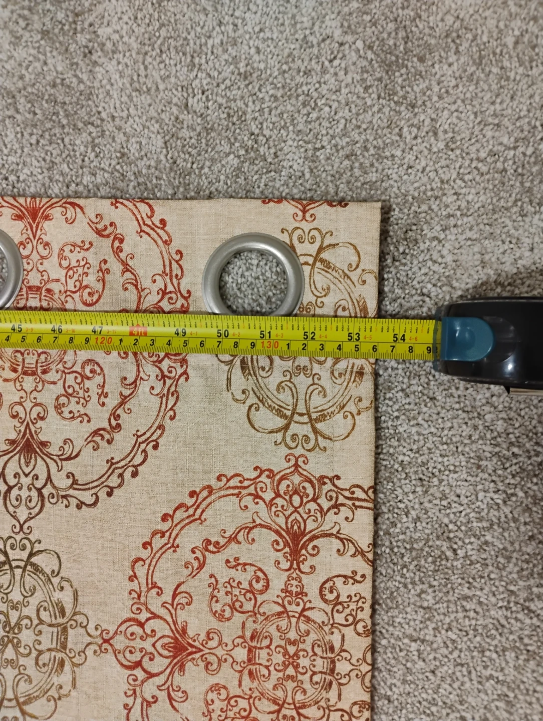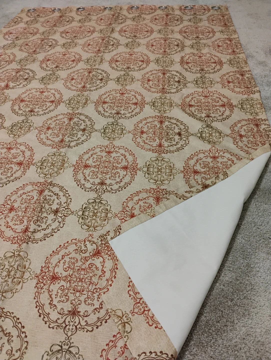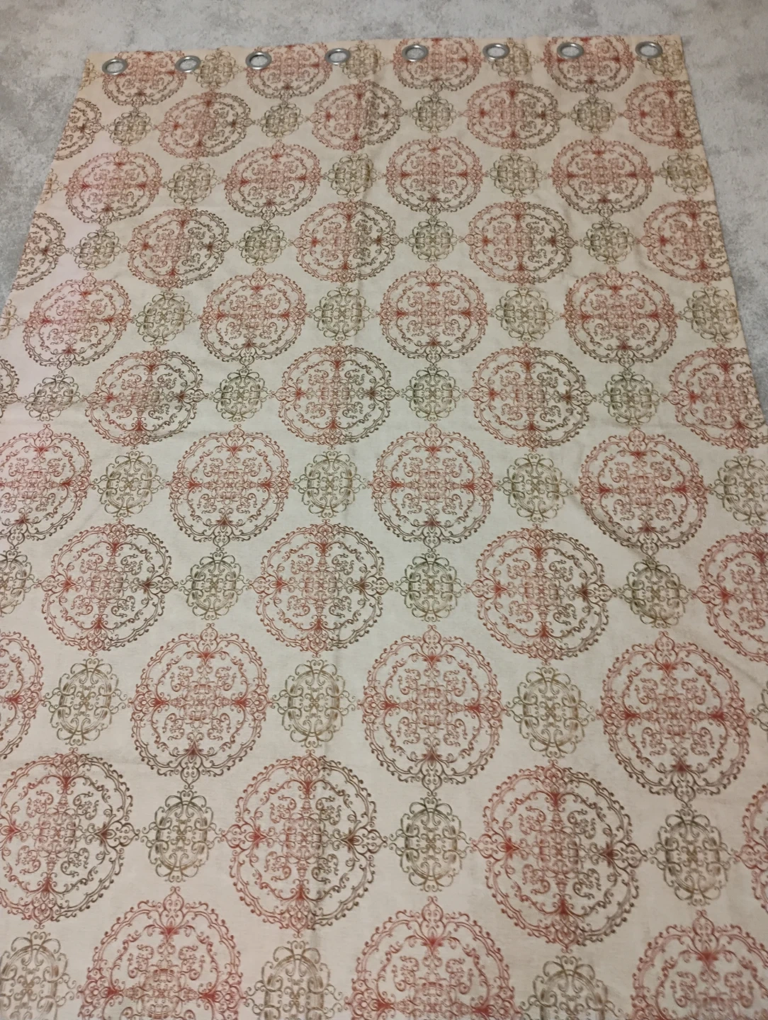 Here's a curtain with a lovely patterned design in beige, red, and brown. It measures approximately 84 inches in length and 54 inches in width. It would be a great addition to any room! Total 5 panels. The price is for each panel. Light filtering. Excellent condition.