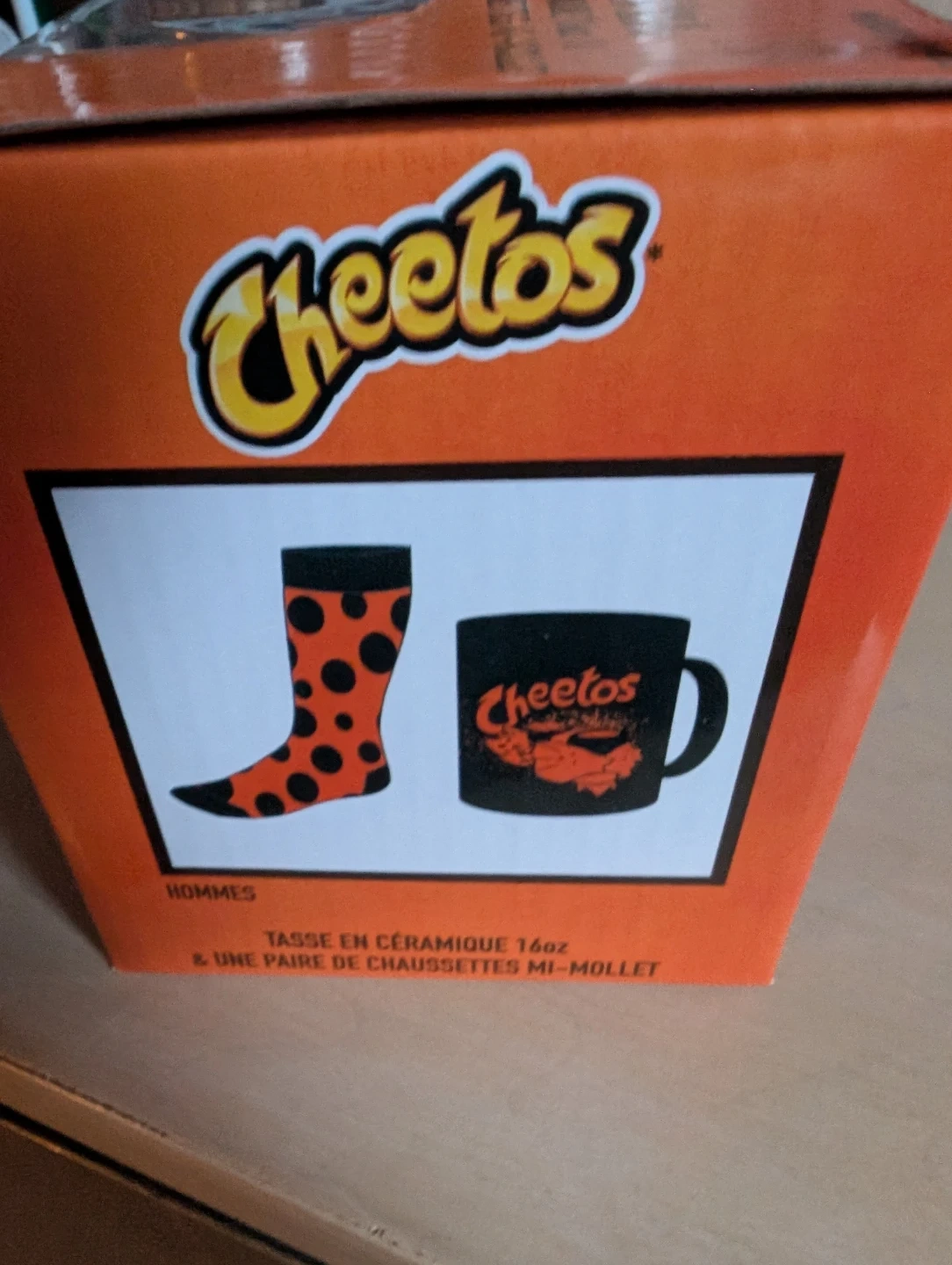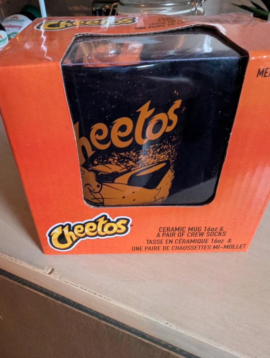 Selling a brand new Cheetos mug and socks set! It comes in the original box. The mug is ceramic and holds 16oz. The socks are crew socks. Perfect for any Cheetos lover!