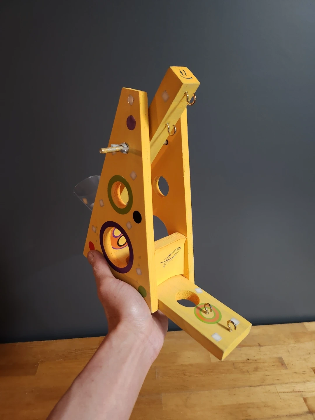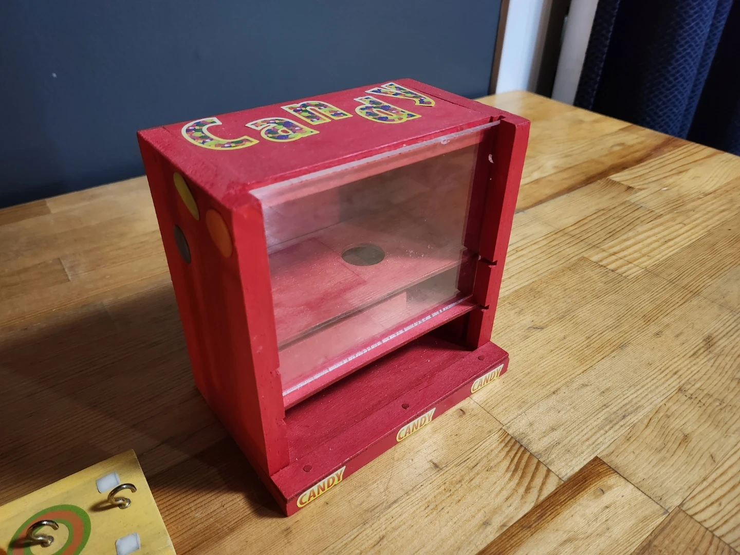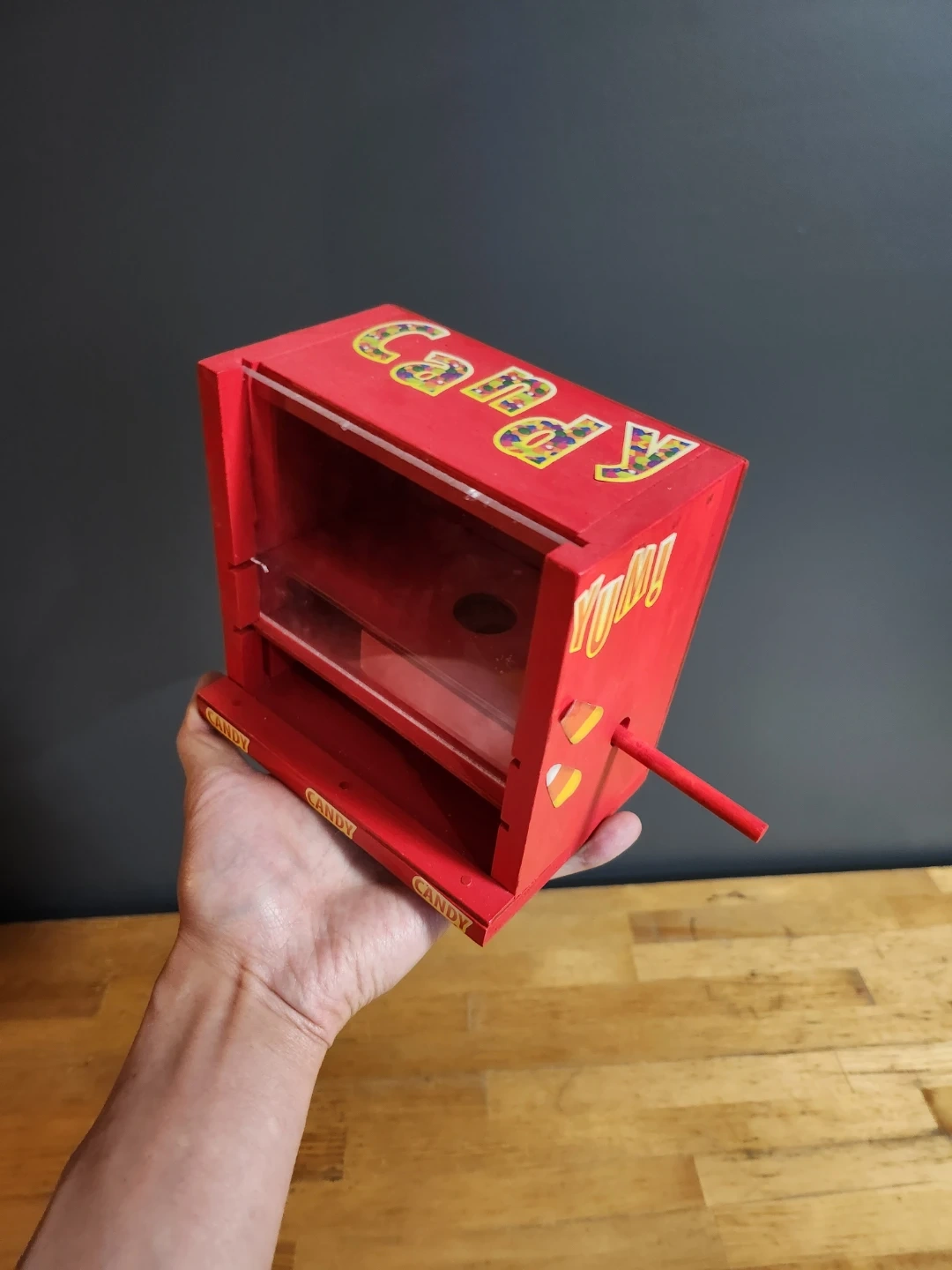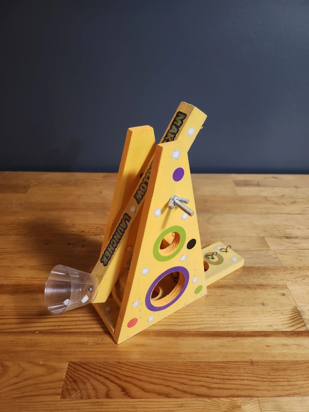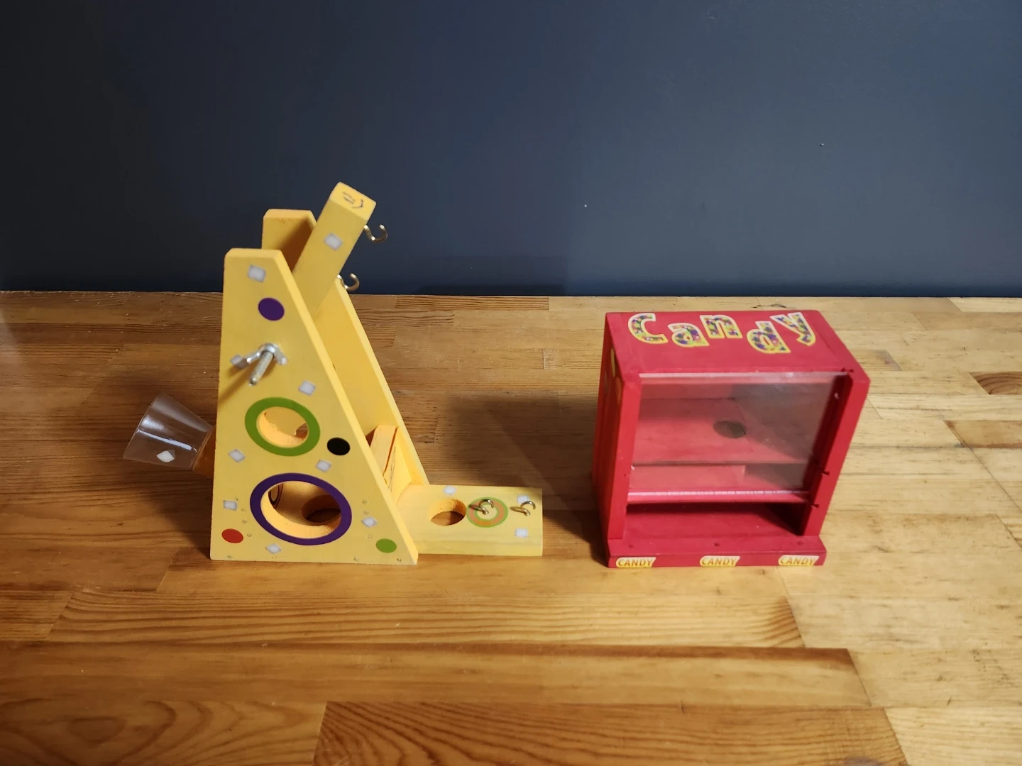 Cute wooden toy set! Includes a marshmallow launcher and a candy dispenser. Both are in great condition and ready for some fun times!