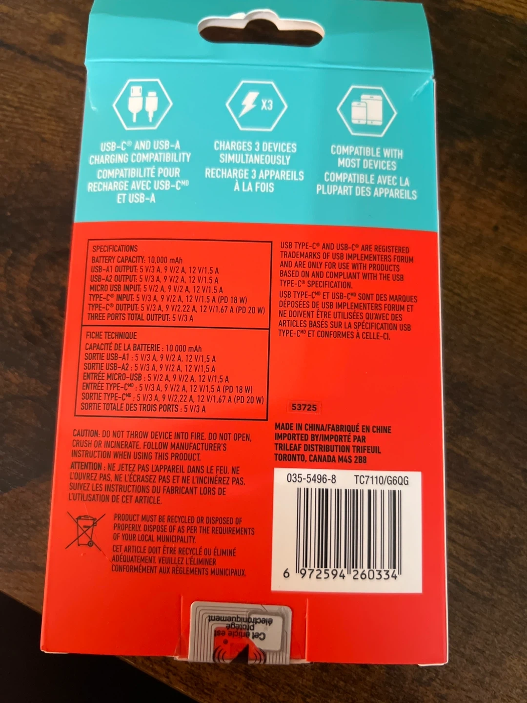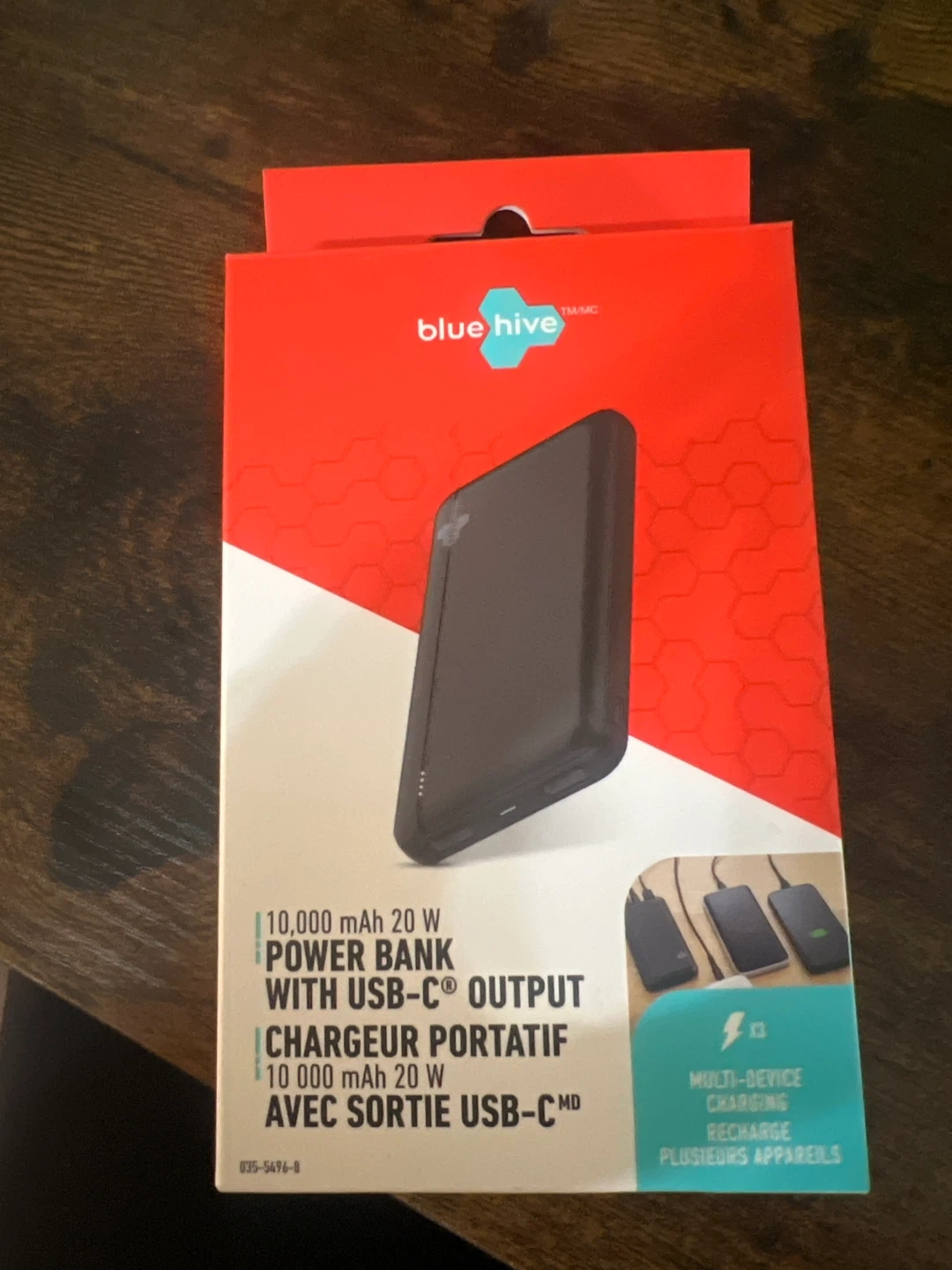 Selling a brand new Blue Hive 10,000 mAh power bank! It has a USB-C output and can charge 3 devices simultaneously. The battery capacity is 10,000 mAh, and it's compatible with most devices. Comes in the original box