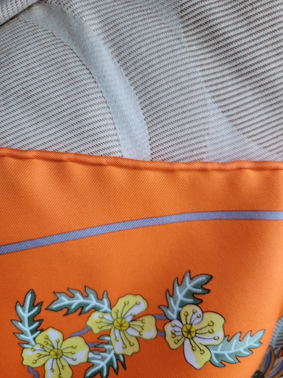 Selling a beautiful Authentic Hermès Paris silk scarf in an orange colour with a floral design. The scarf is 100% silk and comes with its original box. It features the 'Planifleurs' design. Perfect for adding a touch of elegance to any outfit! It has only been worn a couple of times, it does have a little mark on it see last picture, it will most likely come out from dry cleaning, however not noticeable. Just want full disclosure!