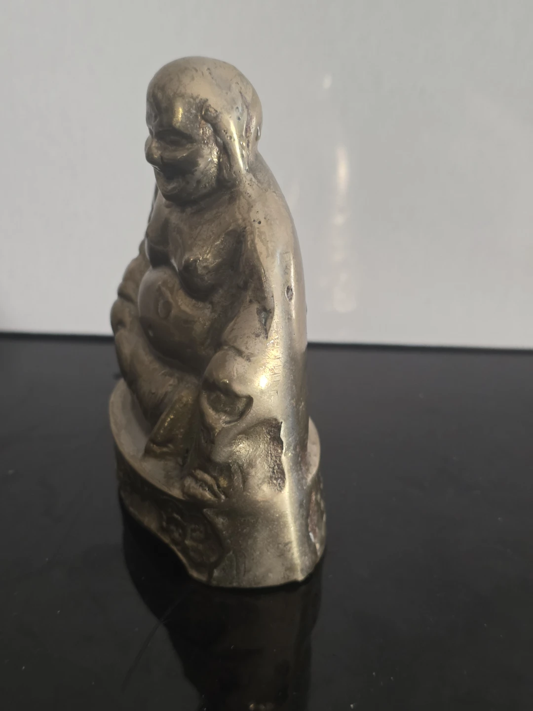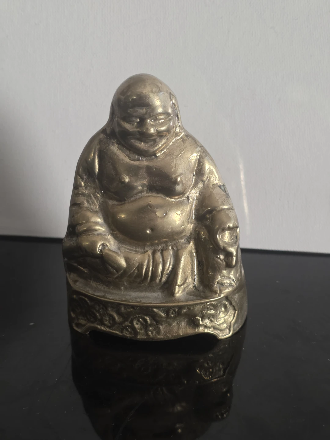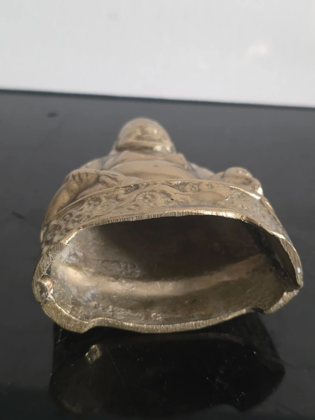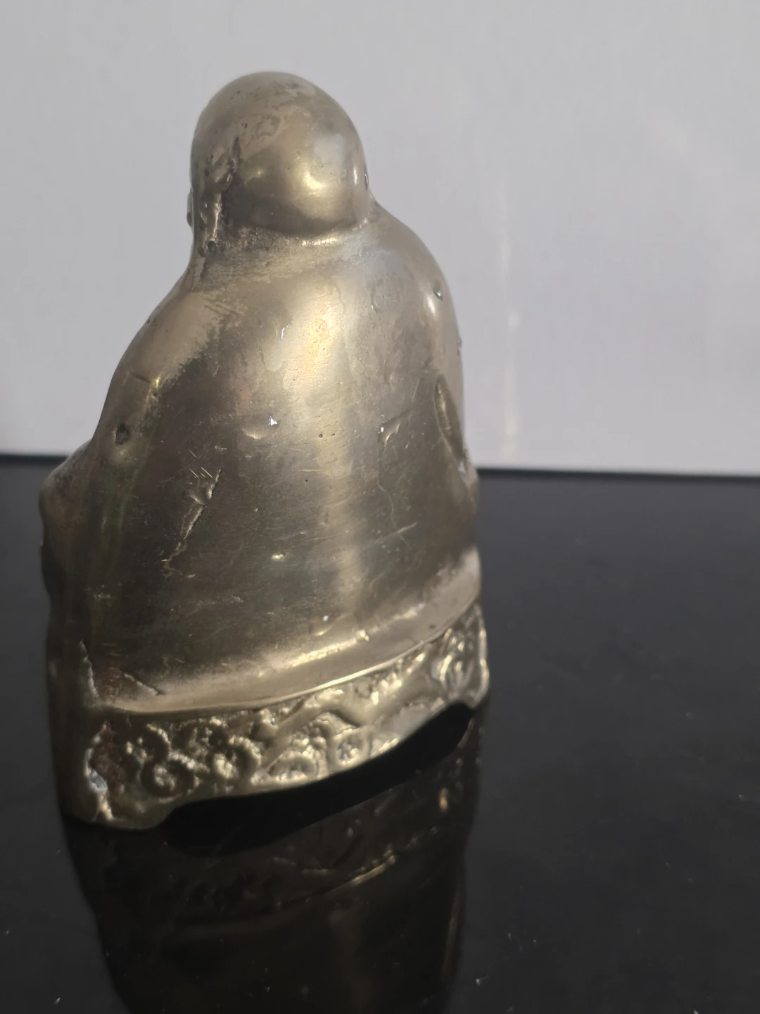 The image shows a vintage brass figurine of the Laughing Buddha, also known as Budai. This figure is a common symbol of good luck, happiness, and abundance.