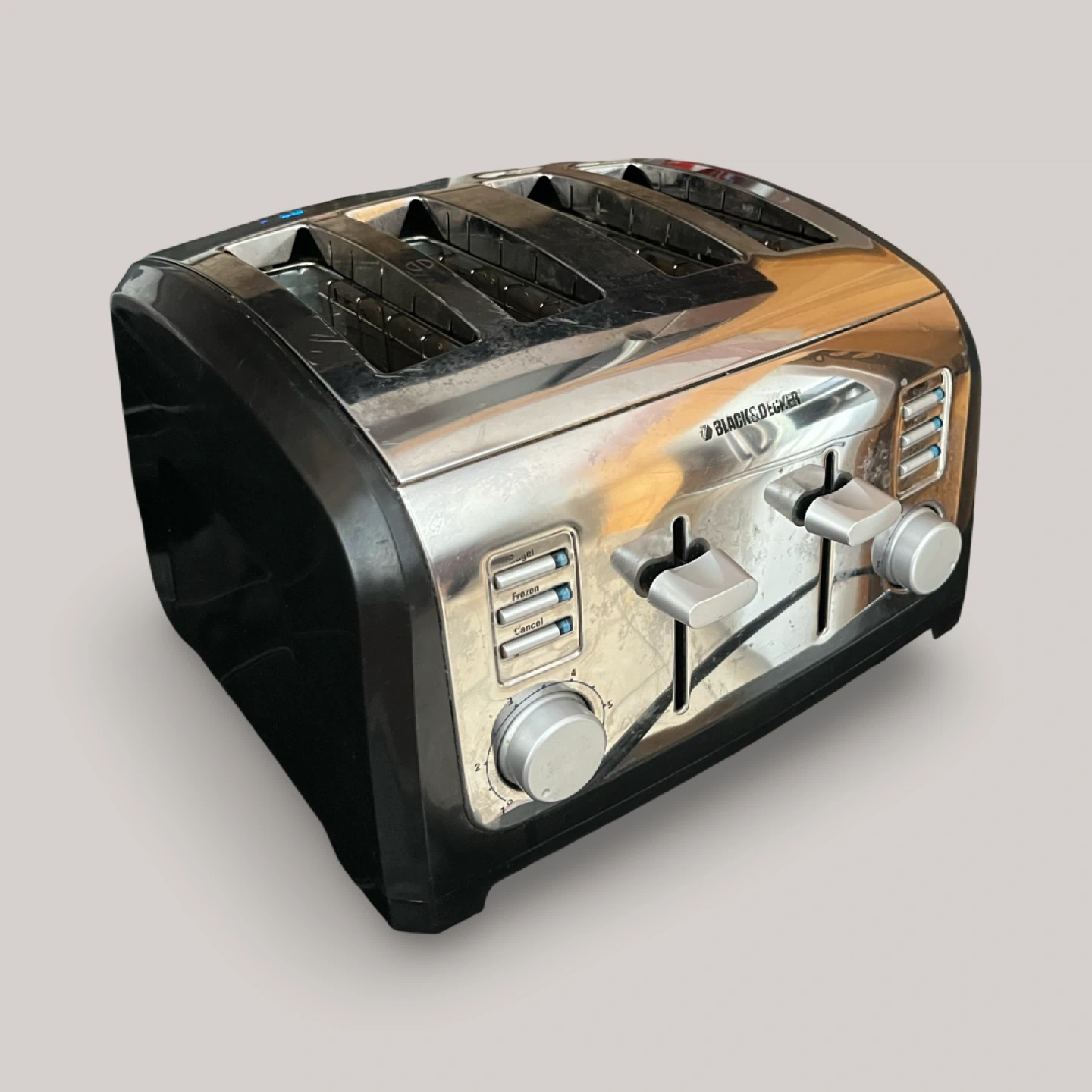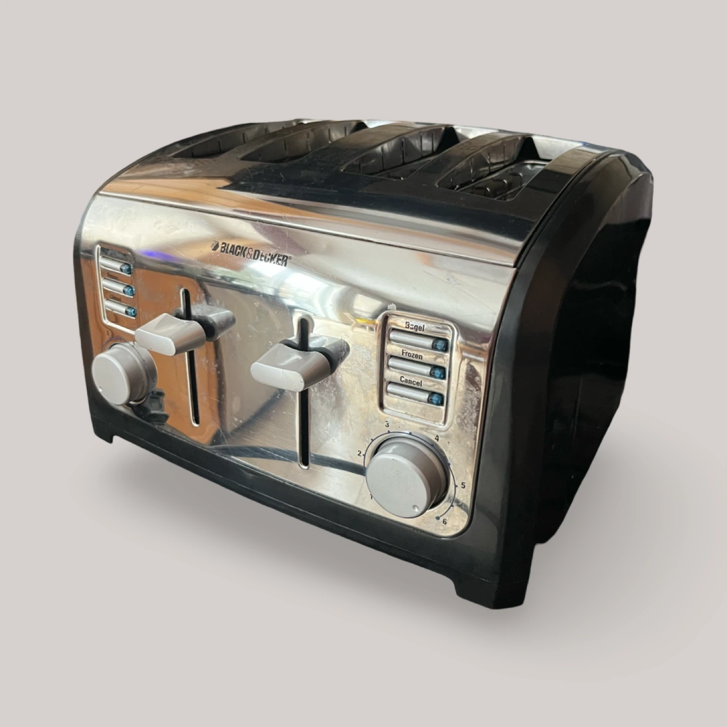 Selling a Black+Decker 4-slice toaster. It has settings for bagel, frozen, and cancel. This toaster would be perfect for a family or anyone who likes to toast bread, bagels or frozen pastry!