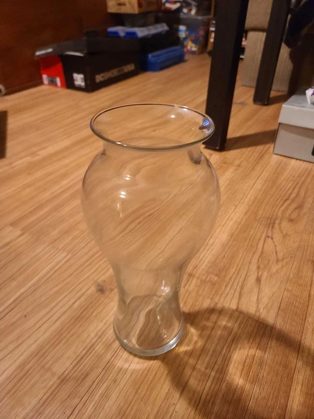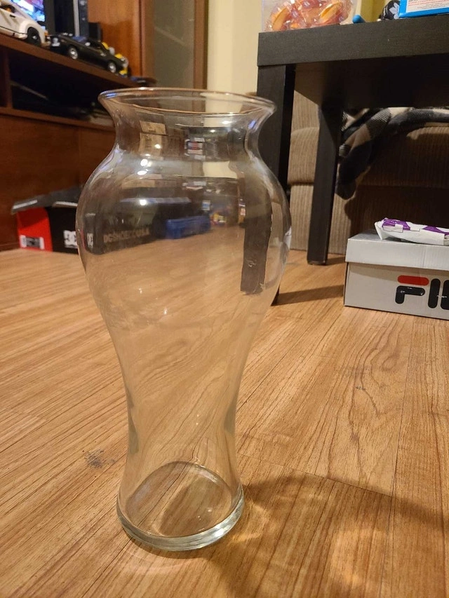 This elegant glass vase is a timeless addition to any home decor, perfect for displaying your favourite flowers or as a standalone decorative piece. This piece is in good condition and ready to brighten up your space. With its classic silhouette and crystal-clear glass, this vase effortlessly complements any style, from modern minimalist to cozy farmhouse chic. Add a touch of floral charm to your living room, dining table, or bedroom with this beautiful vase! If the ad is still up, rest assured, the vase is still available!