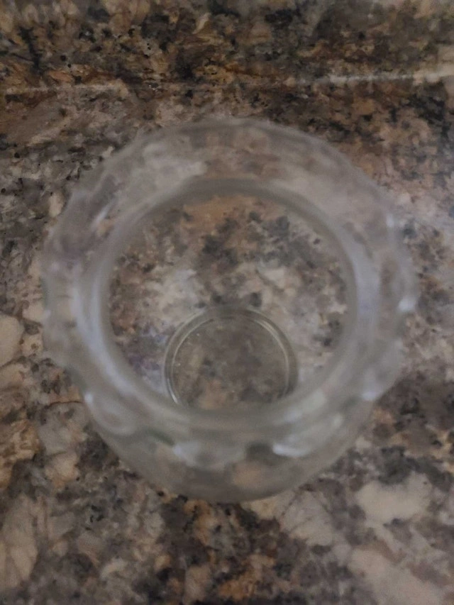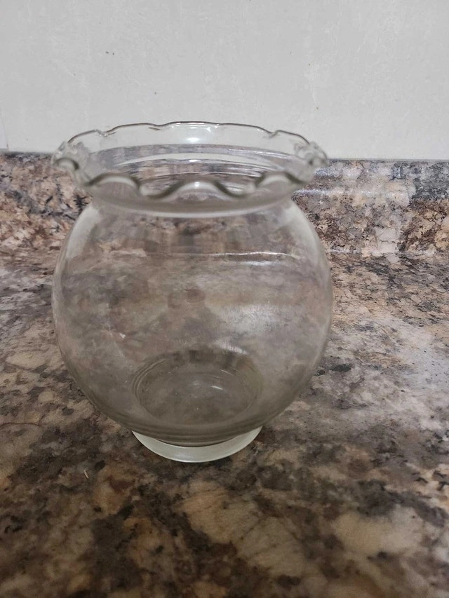 This is a used glass bowl with a fluted edge and a round base, perfect for various decorative uses. It shows some signs of wear but is generally in good condition. Ready to find a new home! I'm setting this at $10, but willing to consider reasonable offers! If you're seeing this ad, the bowl is still available!
