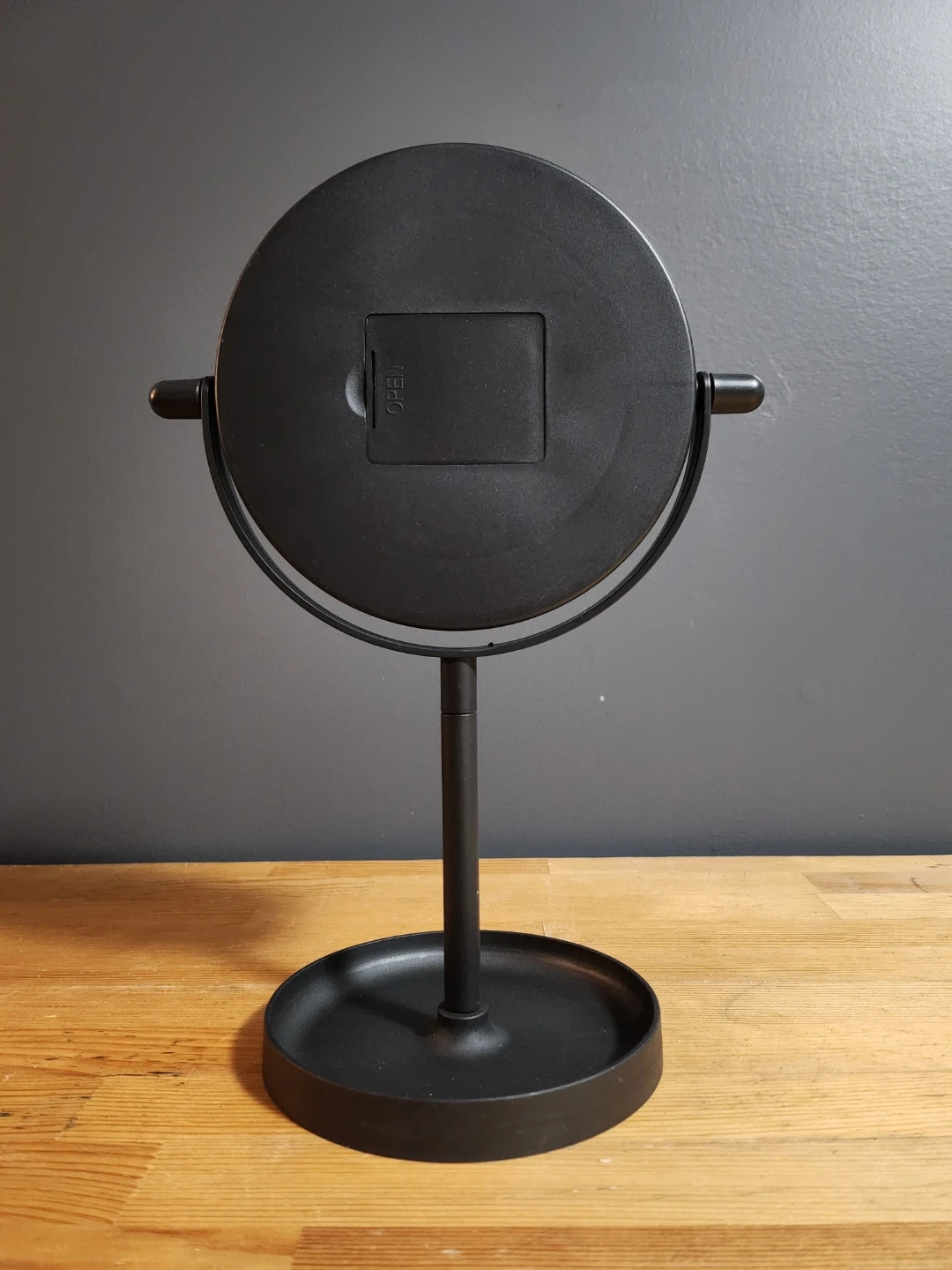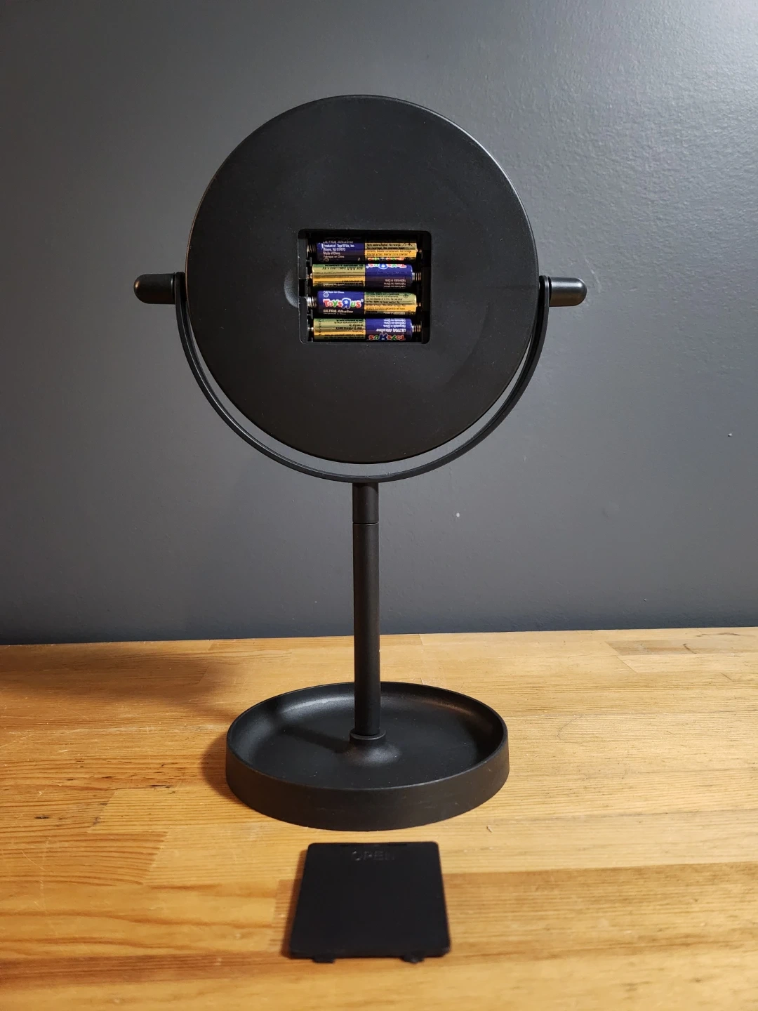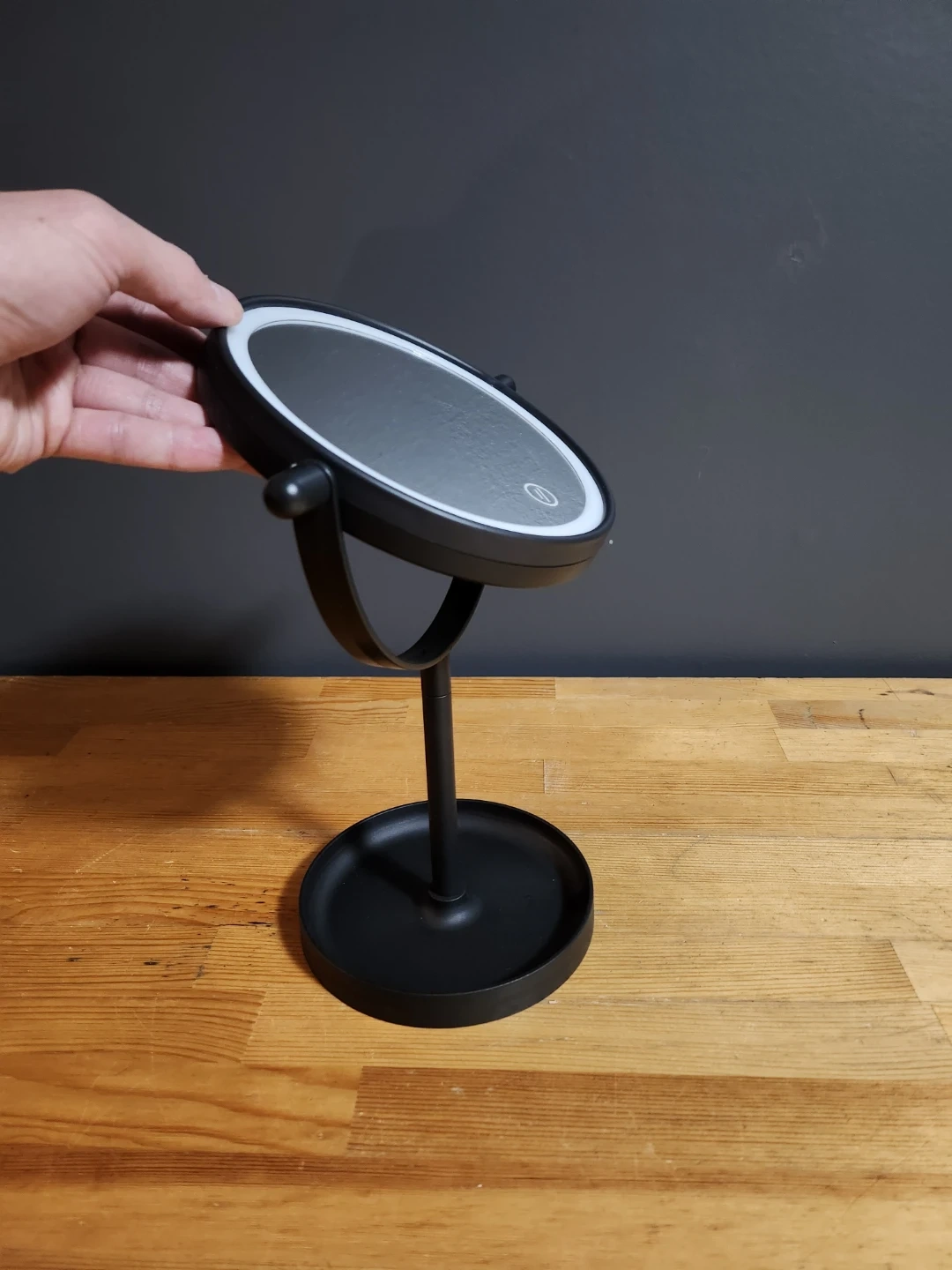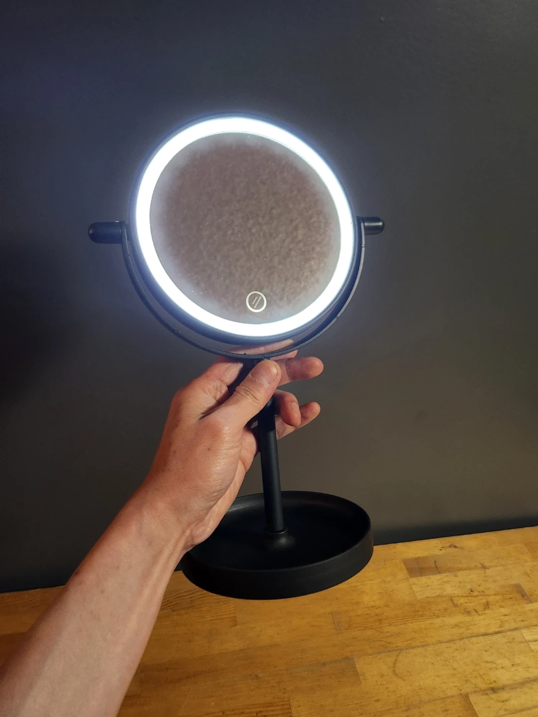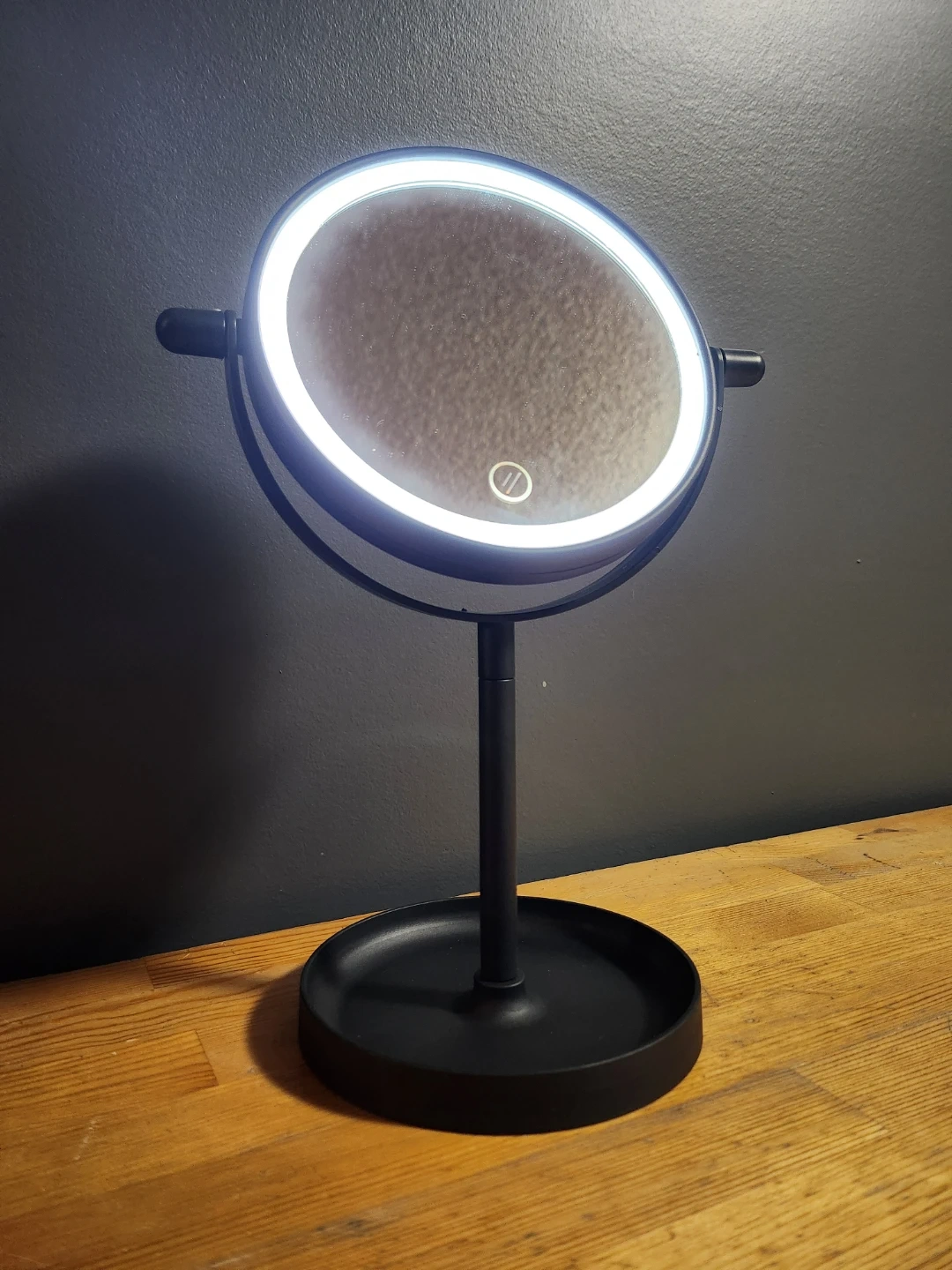 Black vanity mirror with built-in touch LED lighting. Perfect for your makeup routine or just checking yourself out. It has a sleek, modern design that would look great on any vanity or dresser. Requires 4 AAA Batteries.