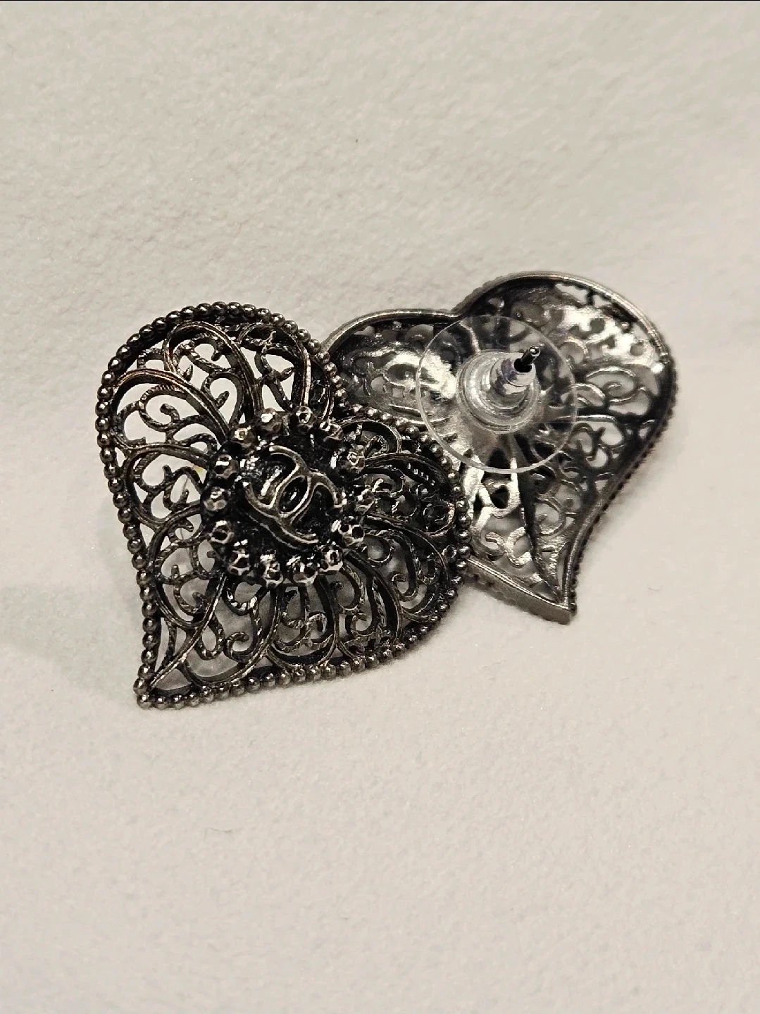 Selling a pair of Chanel heart earrings. These have a filigree design and the classic Chanel logo in the center. They are in good condition and ready to wear! Perfect for adding a touch of elegance to any outfit and a nice evening out.