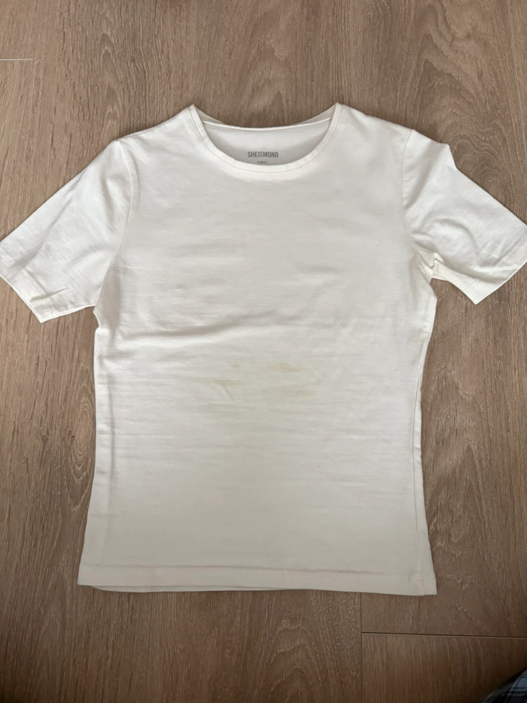 Selling a SHEISMONO white t-shirt in size small. It's a simple and comfy piece for everyday wear. Please note there are some stains on the front. Thats why i kept the price pretty low