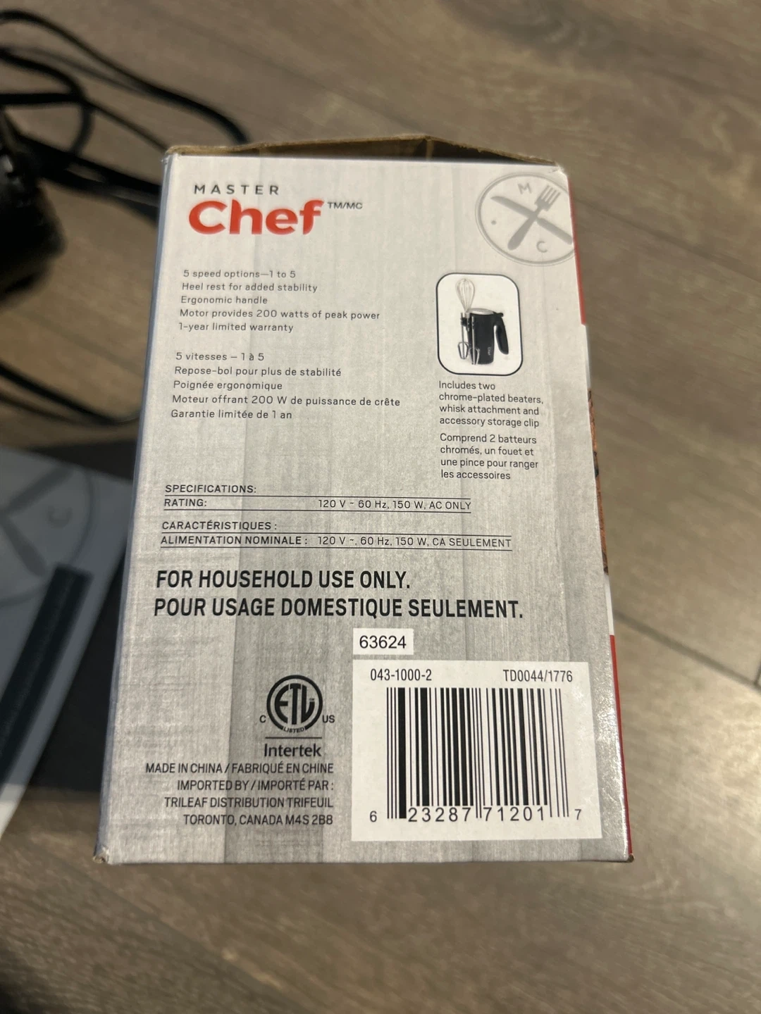 Selling a Master Chef hand mixer in great condition! It comes with the original box and all attachments, including two beaters and a whisk attachment. The mixer has 5 speed options and a heel rest for added stability. It's an ergonomic hand mixer providing 200 watts of peak power. Perfect for all your baking needs!