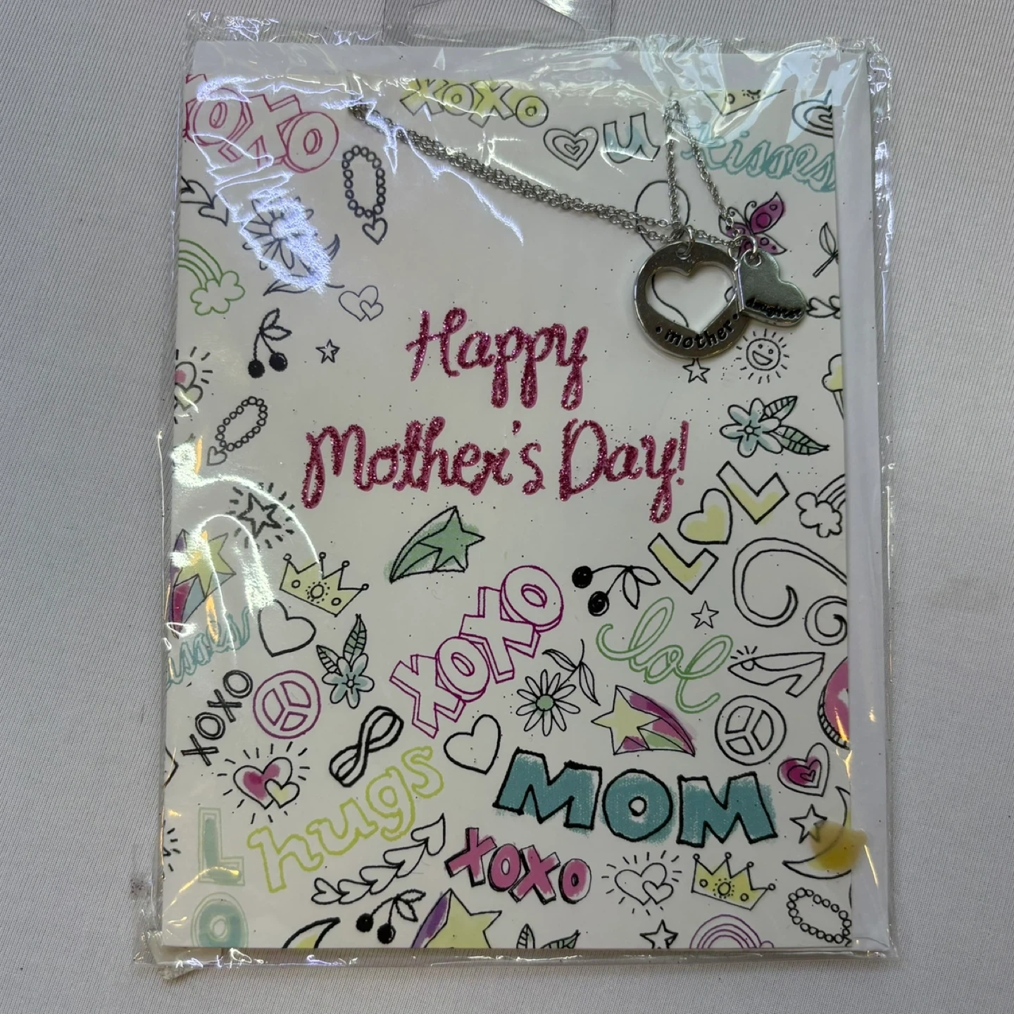 Celebrate Mom with this beautiful Mother’s Day greeting card that includes a matching set of necklaces for both mother and daughter. The card features a vibrant, hand-drawn doodle design with festive "Happy Mother’s Day" messaging.
