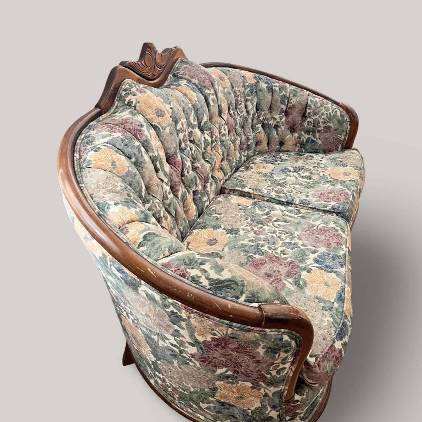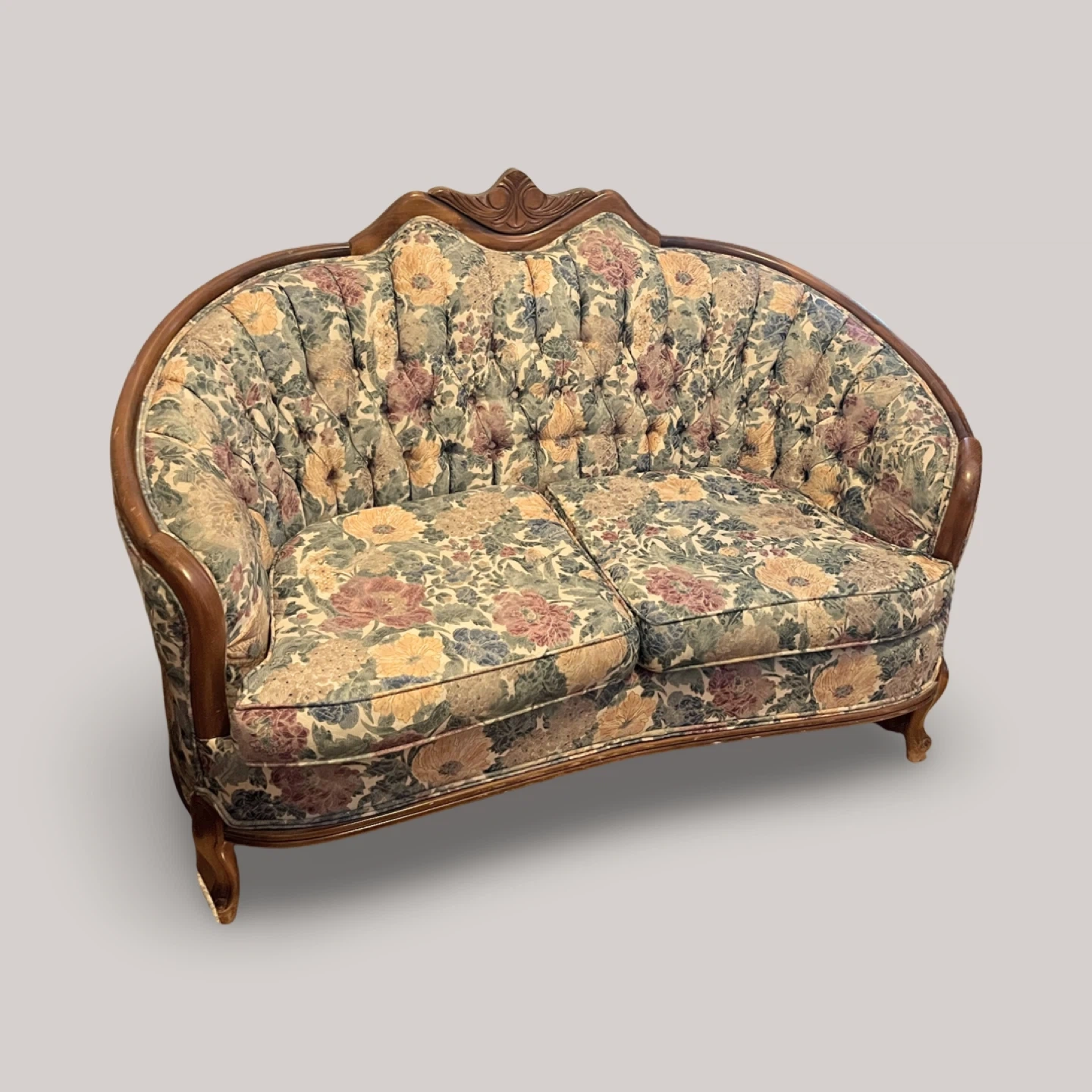 This is a lovely floral patterned sofa. It has a wooden frame and a tufted back. The fabric is in good condition and the sofa is very comfortable. Perfect for adding a touch of vintage charm to your living space