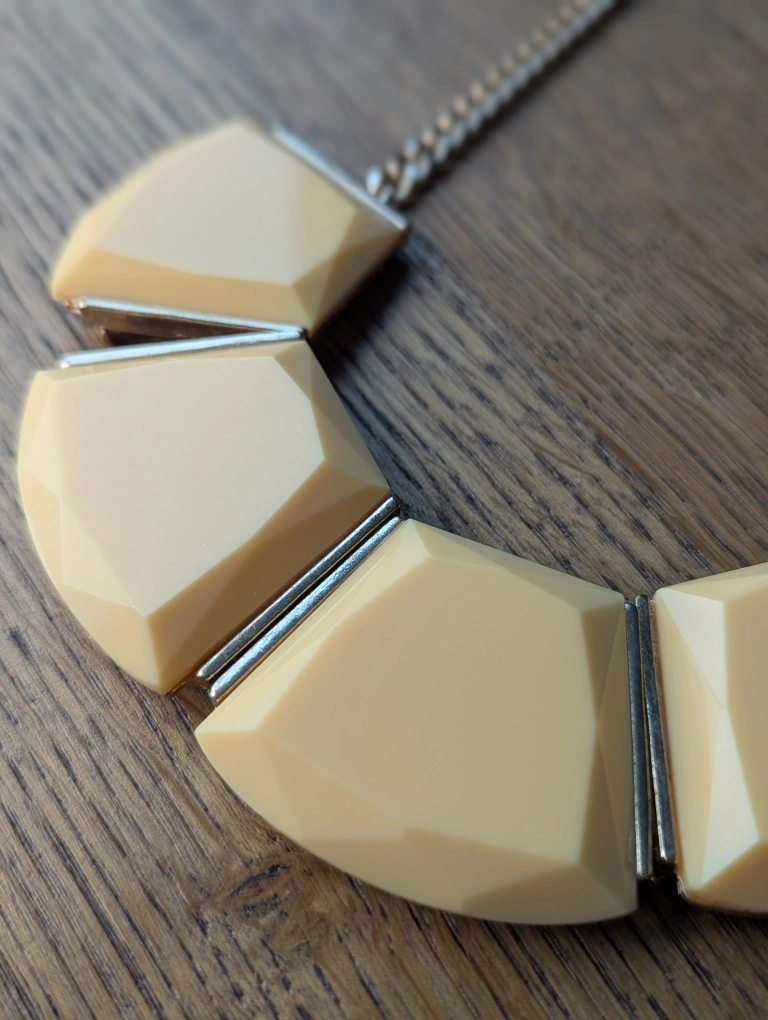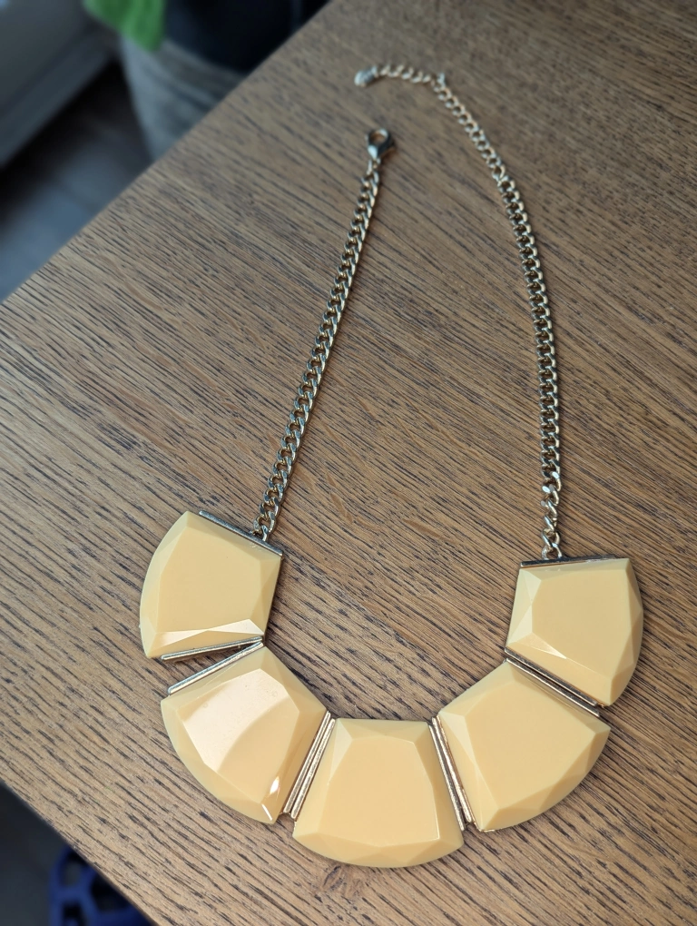 This Aldo statement necklace is in great condition! It features a cream-coloured geometric design with a silver-tone chain. Perfect for adding a unique touch to any outfit